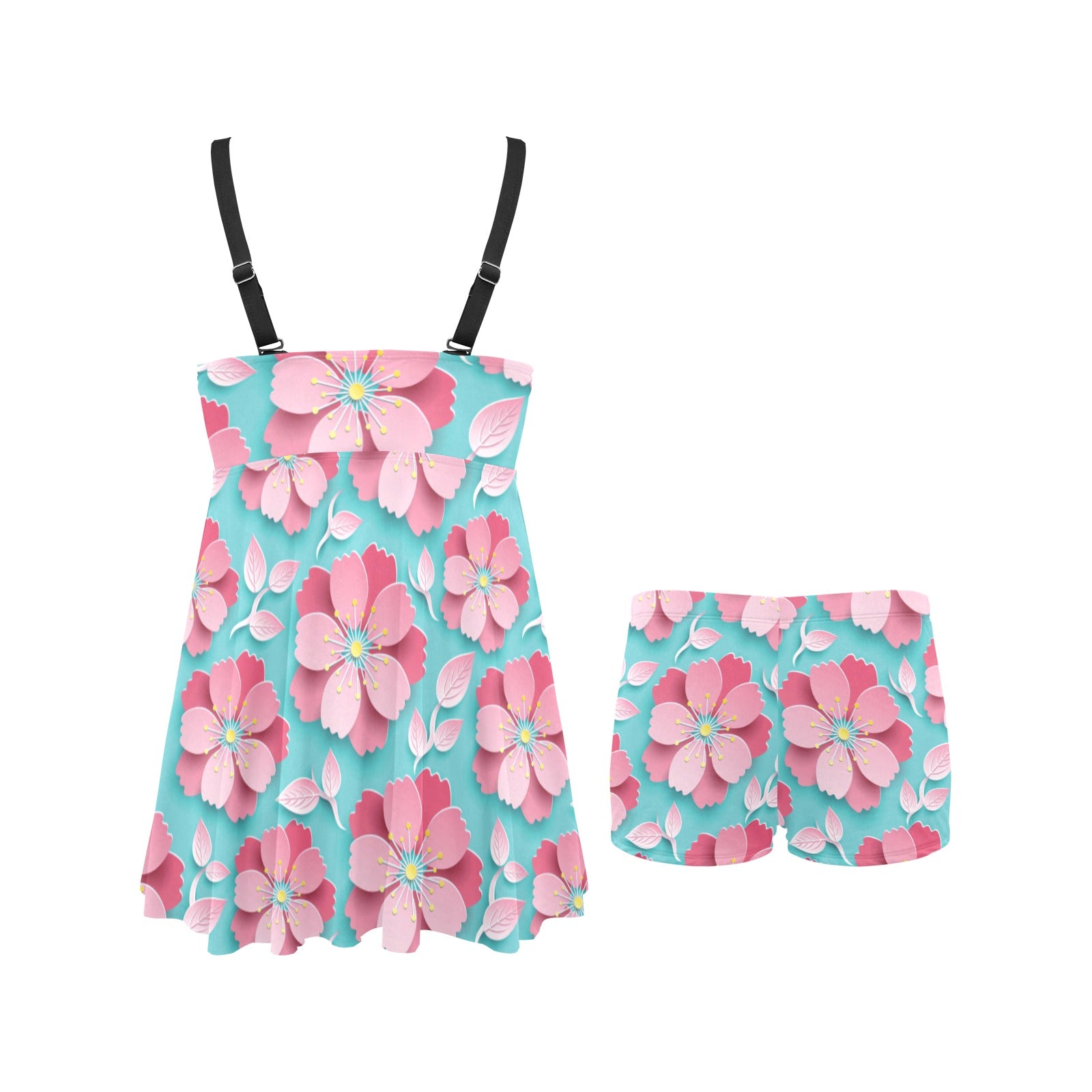 3D sakura cherry blossom pattern Chest Sexy Pleated Two Piece Swim Dress