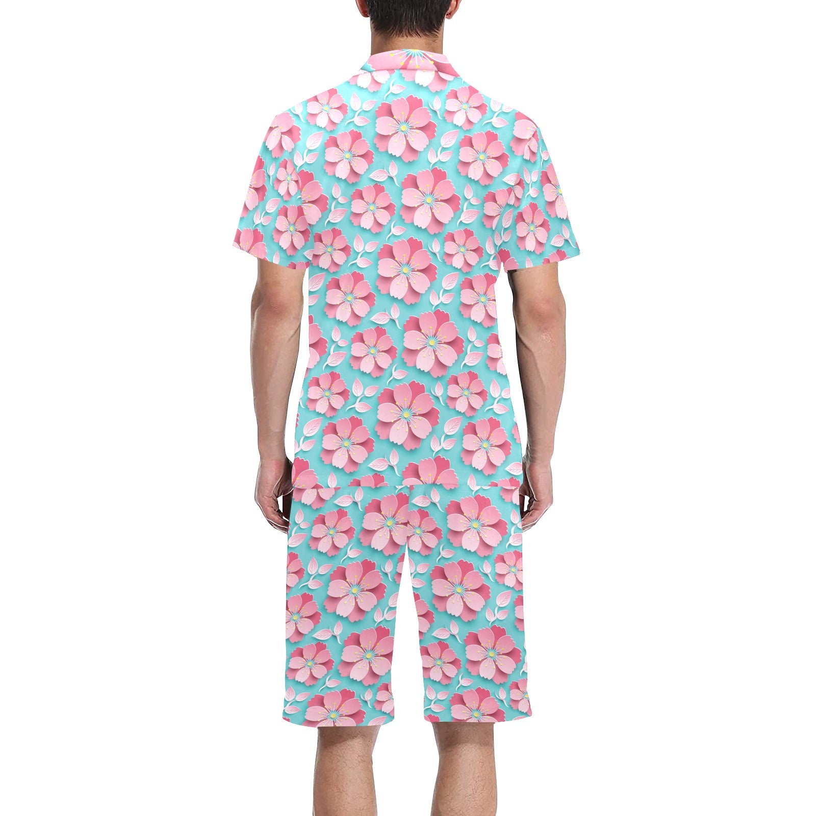3D sakura cherry blossom pattern Men's V-Neck Short Pajama Set