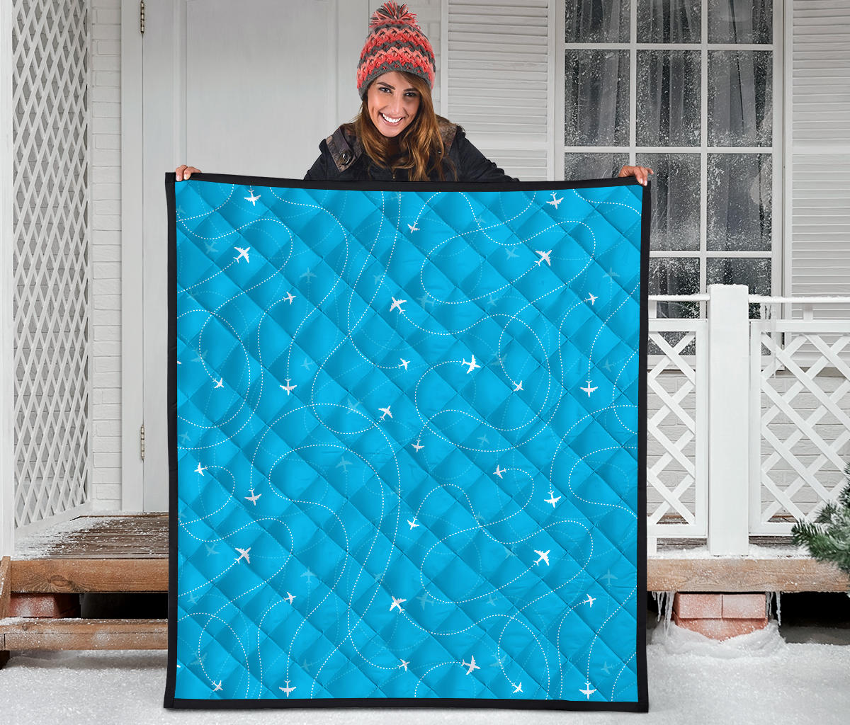 Airplane Destinations Blue Background Premium Quilt is a uniqued design and limited item. It made to order, hand printed, and sewn with love in our factory.