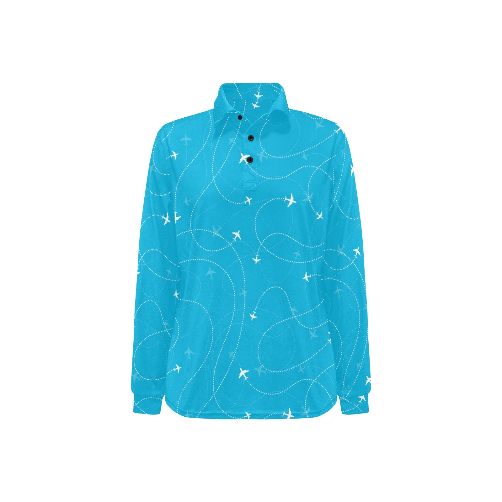 Airplane destinations blue background Women's Long Sleeve Polo Shirt