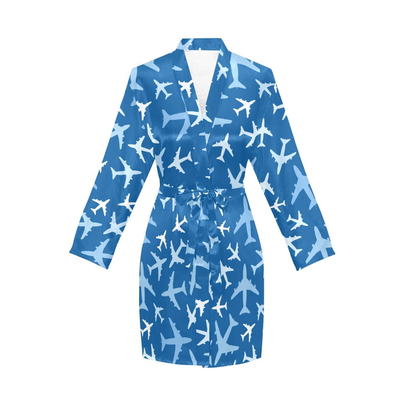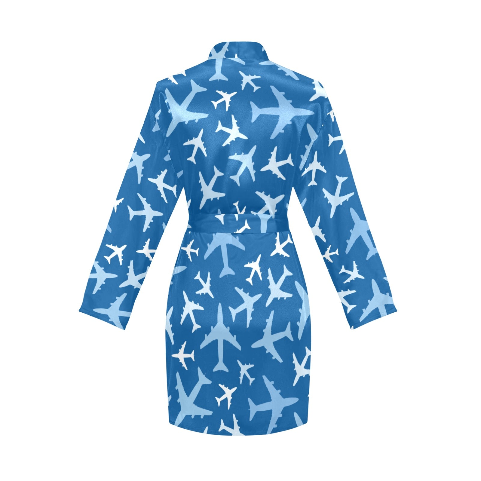 Airplane pattern in the sky Women's Long Sleeve Belted Night Robe