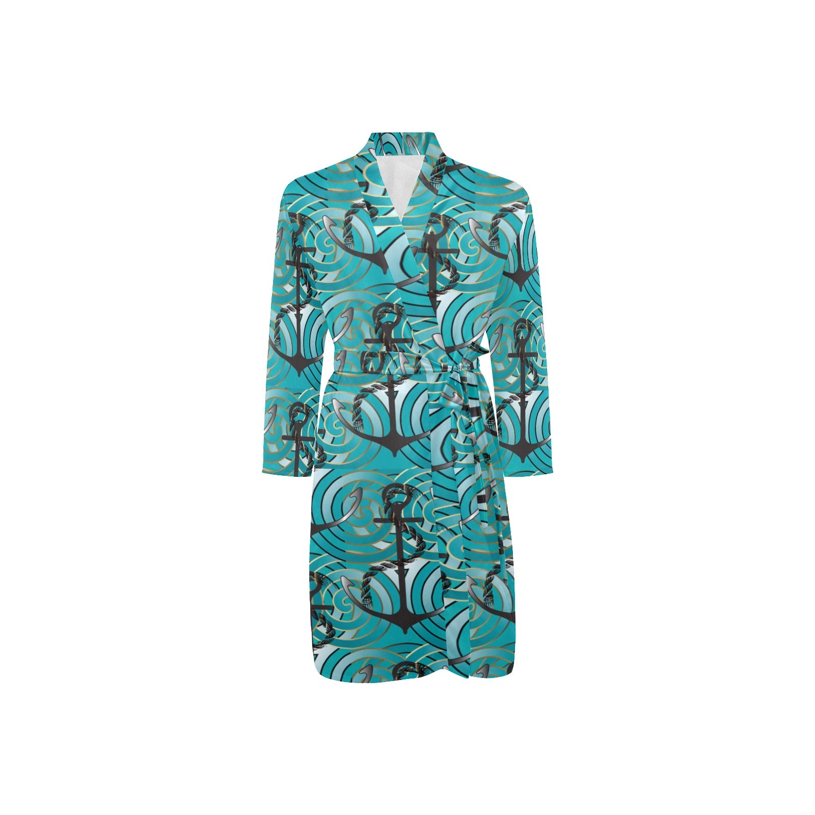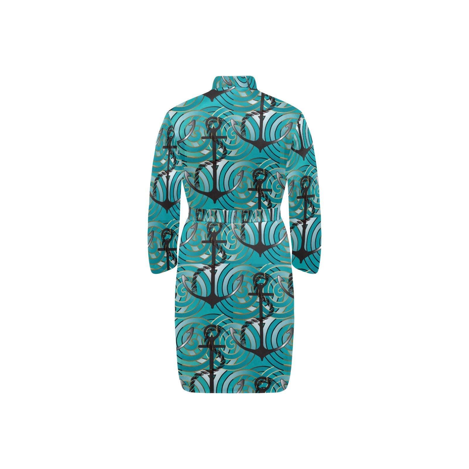 Anchor nautical green background Men's Long Sleeve Belted Night Robe