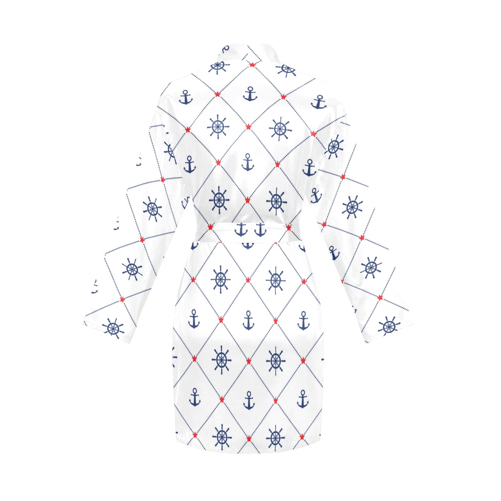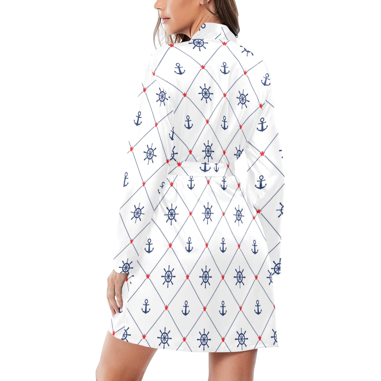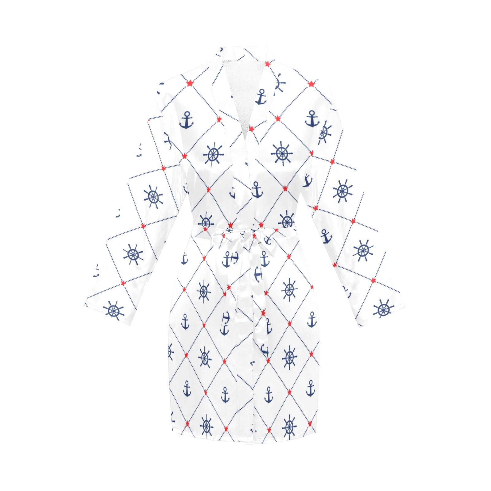 Anchor rudder nautical design pattern Women's Long Sleeve Belted Night Robe