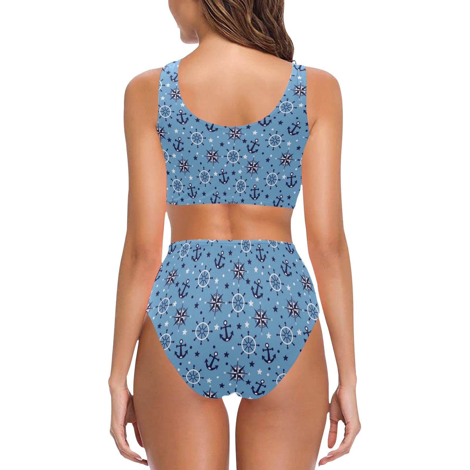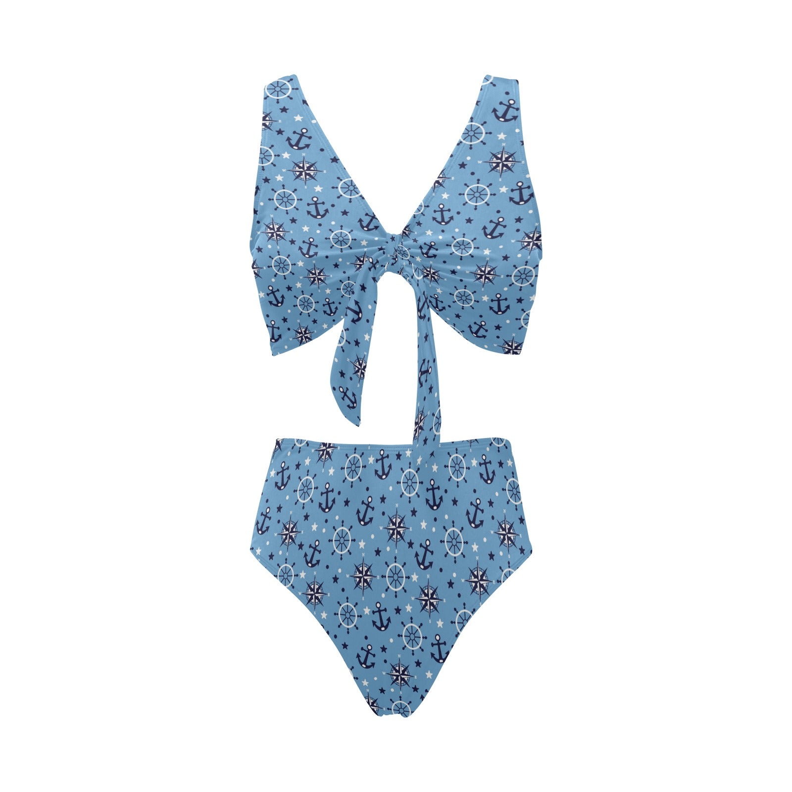 Anchors rudder compass star nautical pattern Chest Bowknot High Waisted Bikini Swimsuit
