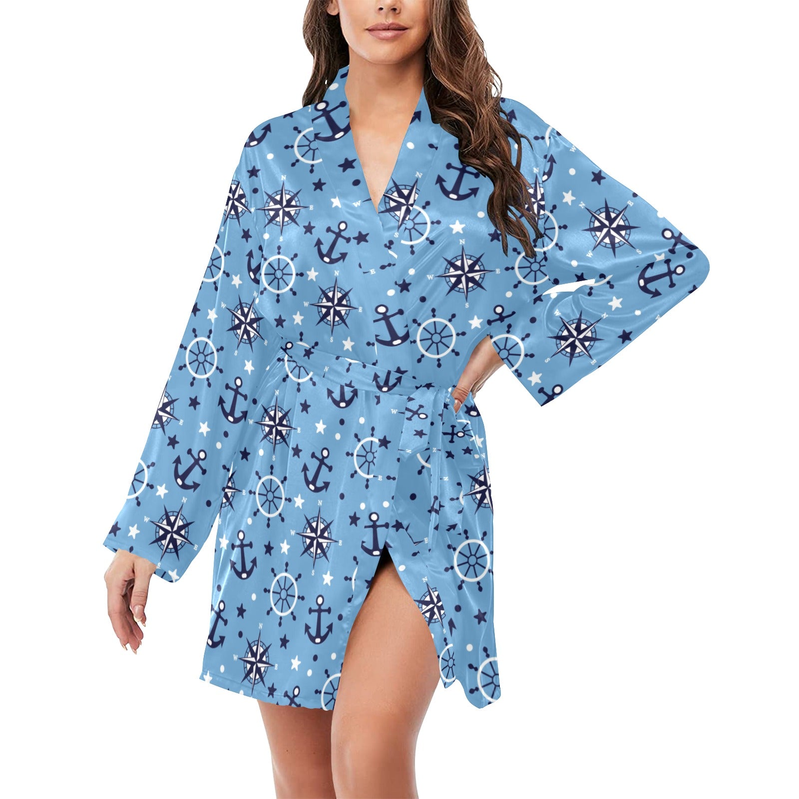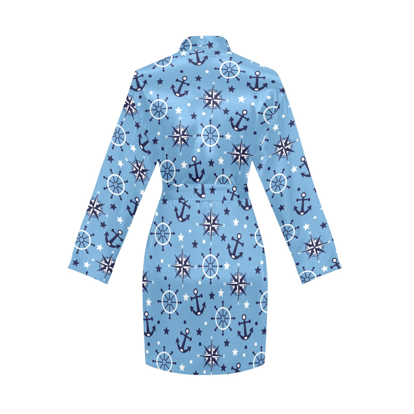 Anchors rudder compass star nautical pattern Women's Long Sleeve Belted Night Robe