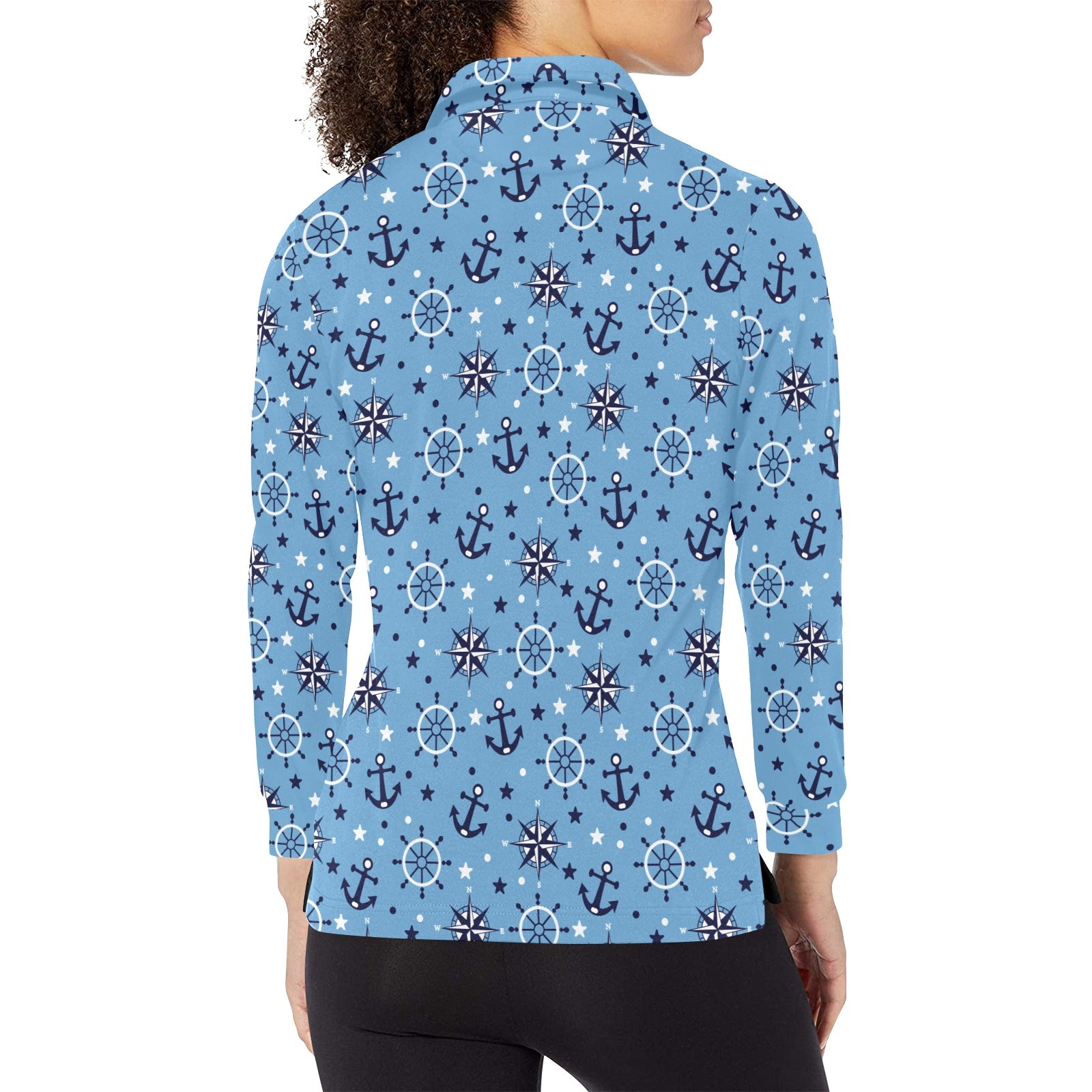 Anchors rudder compass star nautical pattern Women's Long Sleeve Polo Shirt