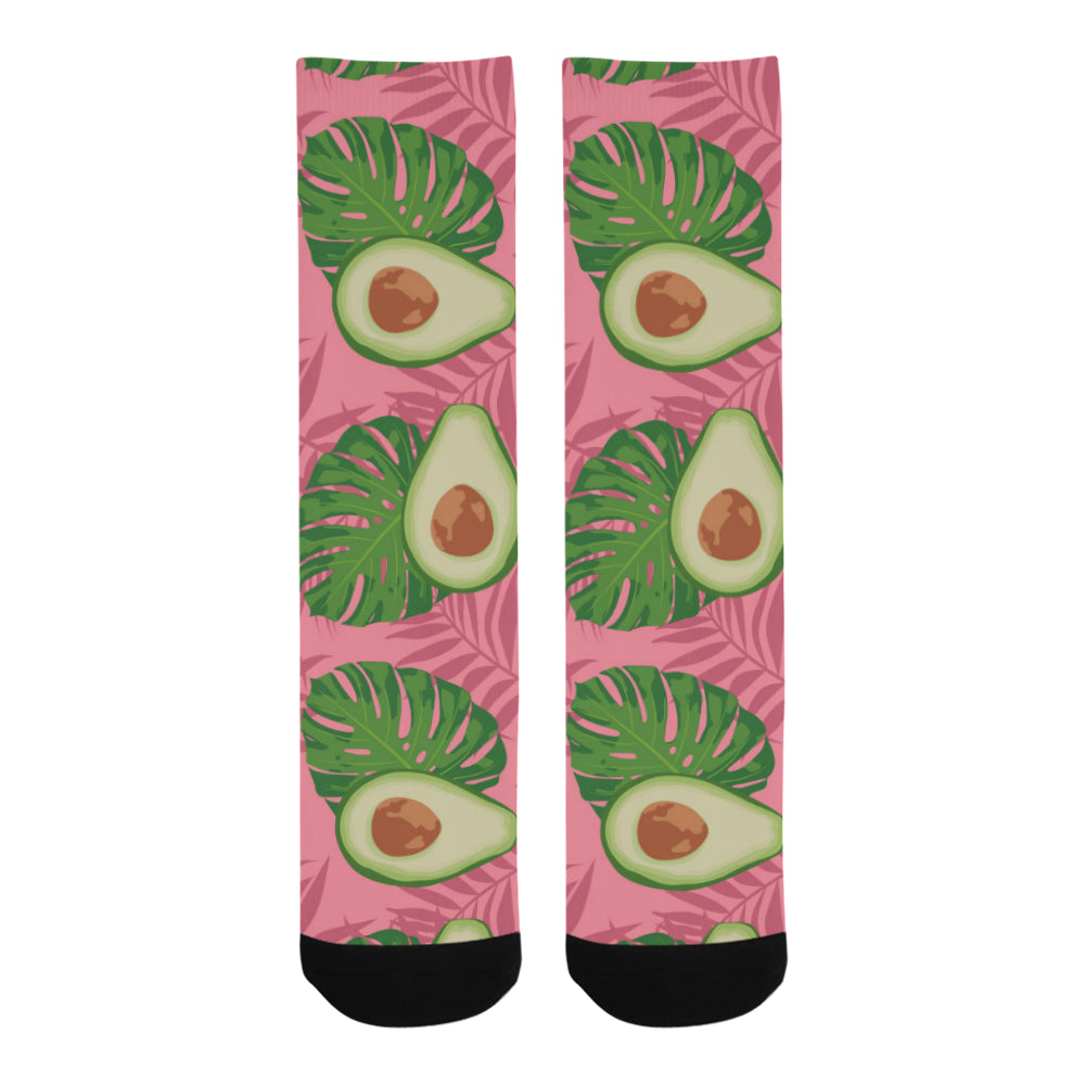 Avocado slices leaves pink back ground Crew Socks are uniqued design and limited item. It made to order, hand printed, and sewn with love in our factory.