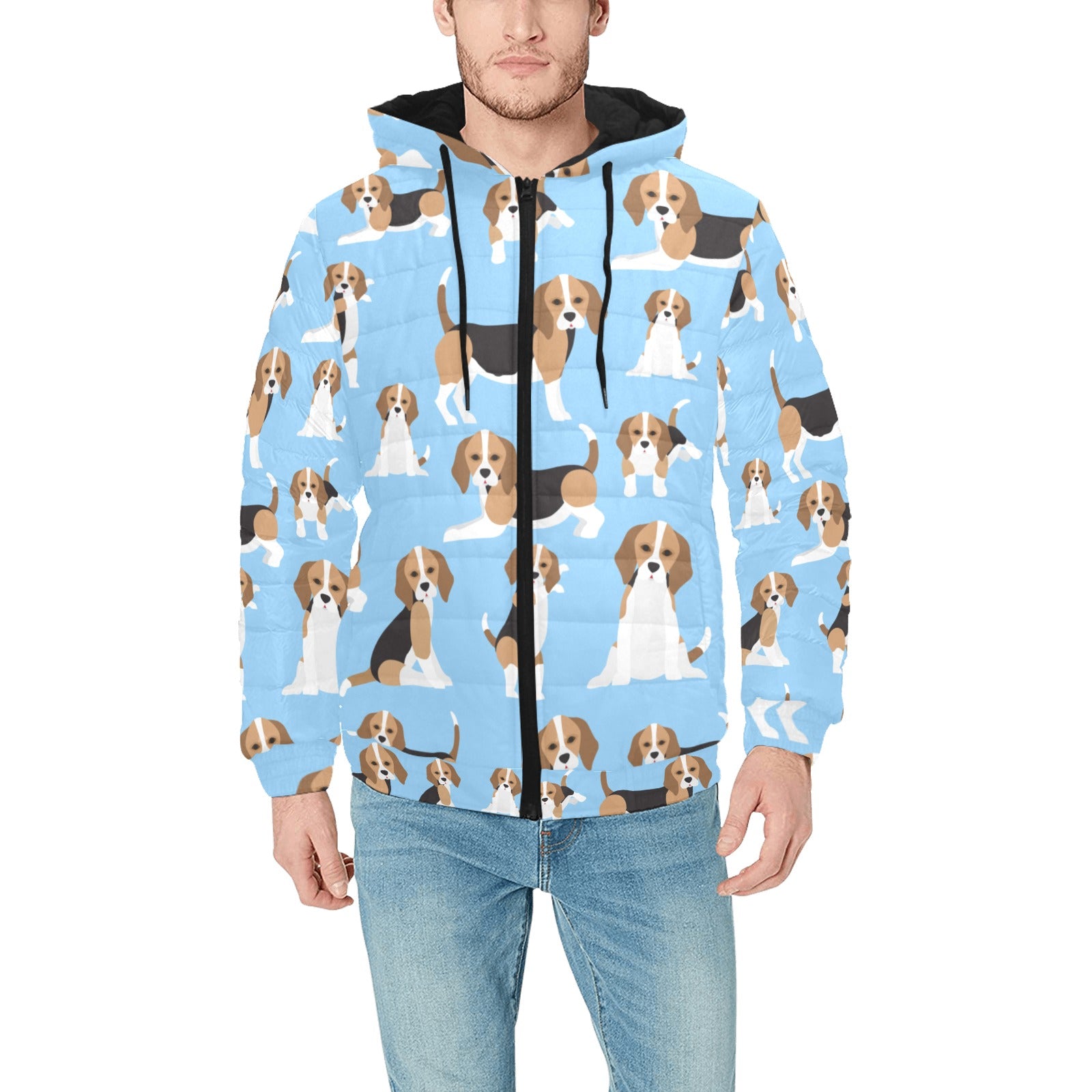 Beagle dog blue background pattern Men's Padded Hooded Jacket