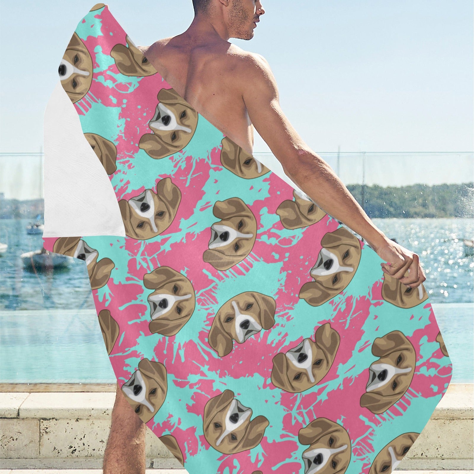 Beagle muzzles turquoise paint splashes pink patte Beach Towel