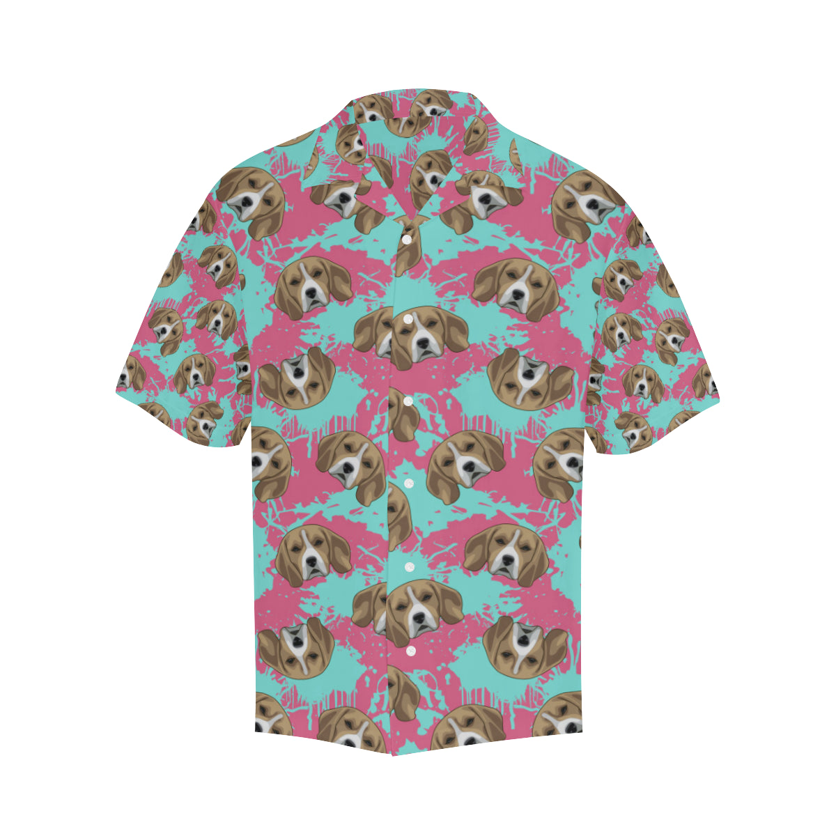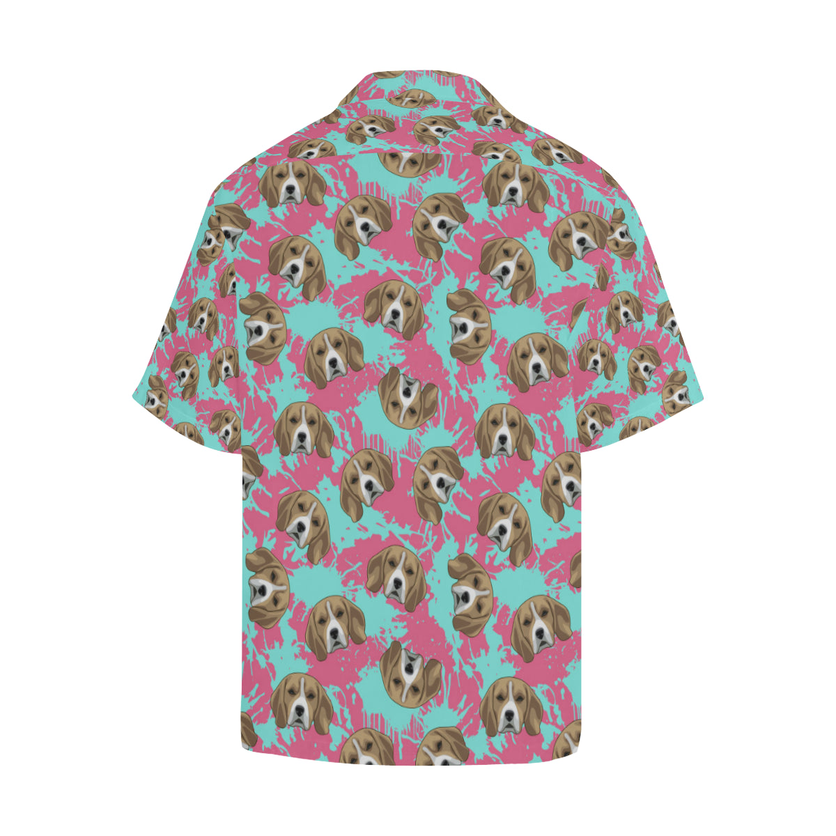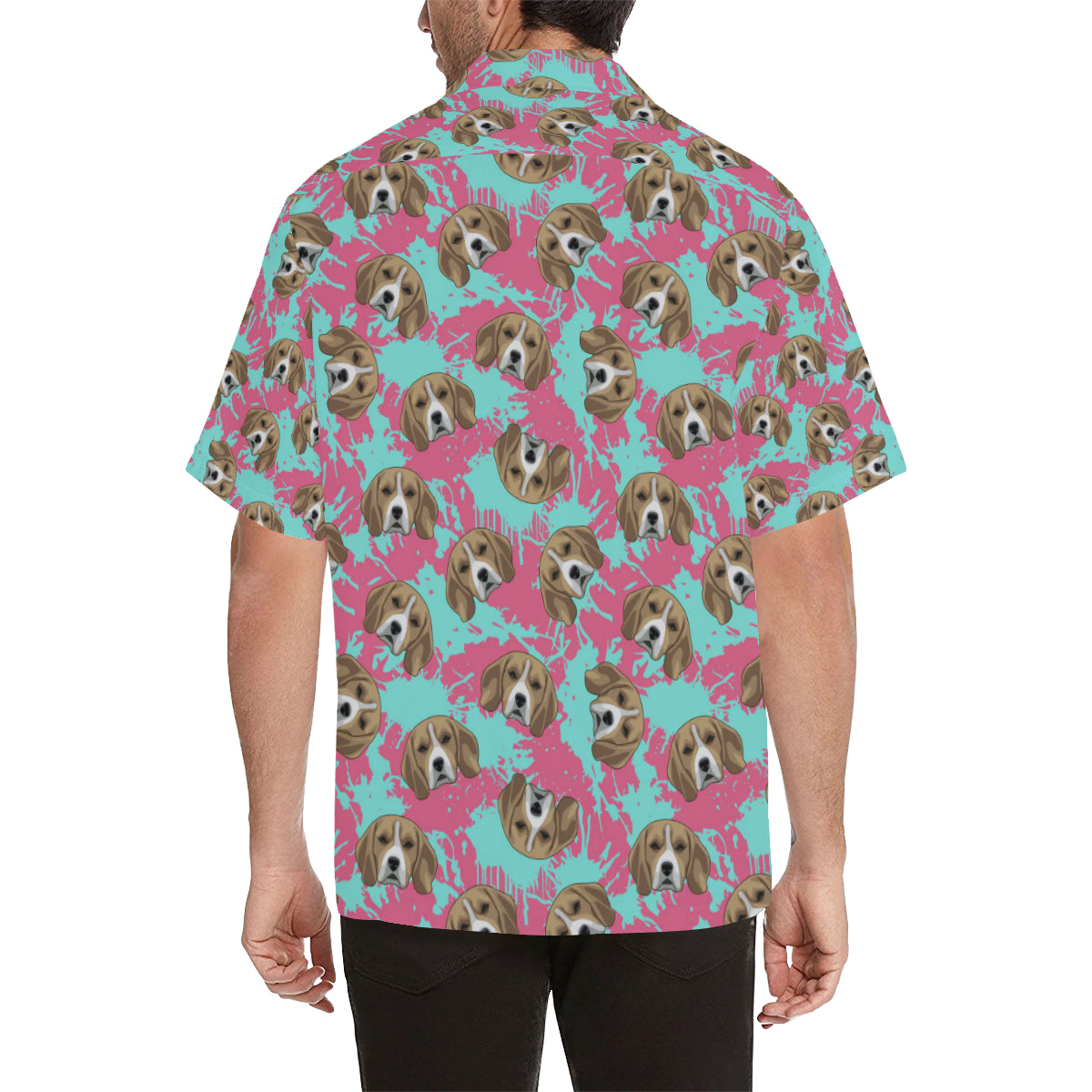 Beagle muzzles turquoise paint splashes pink patte Men's All Over Print Hawaiian Shirt is a uniqued design and limited item. It made to order, hand printed, and sewn with love in our factory.