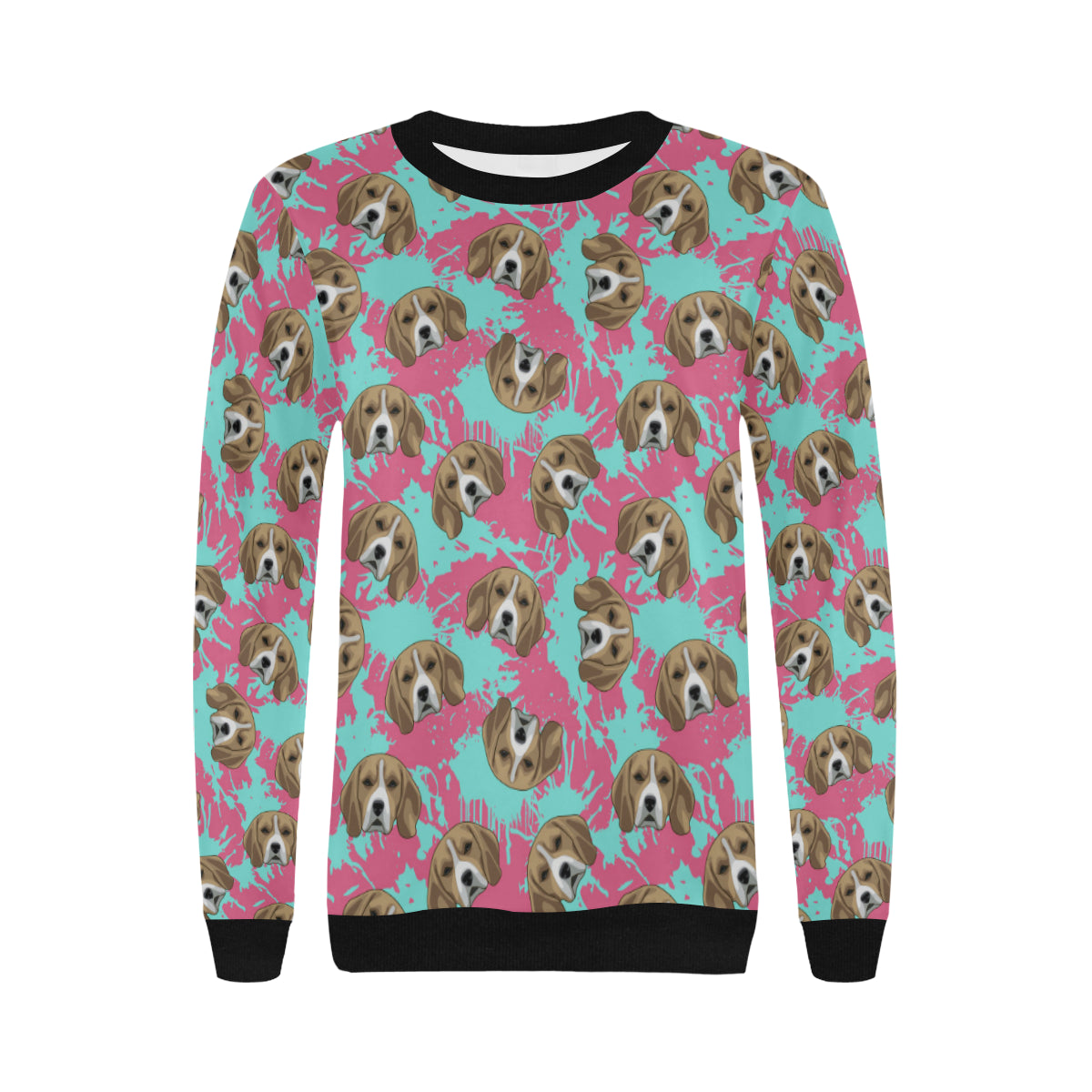 Beagle muzzles turquoise paint splashes pink patte Women's Crew Neck Sweatshirt is a uniqued design and limited item. It made to order, hand printed, and sewn with love in our factory.