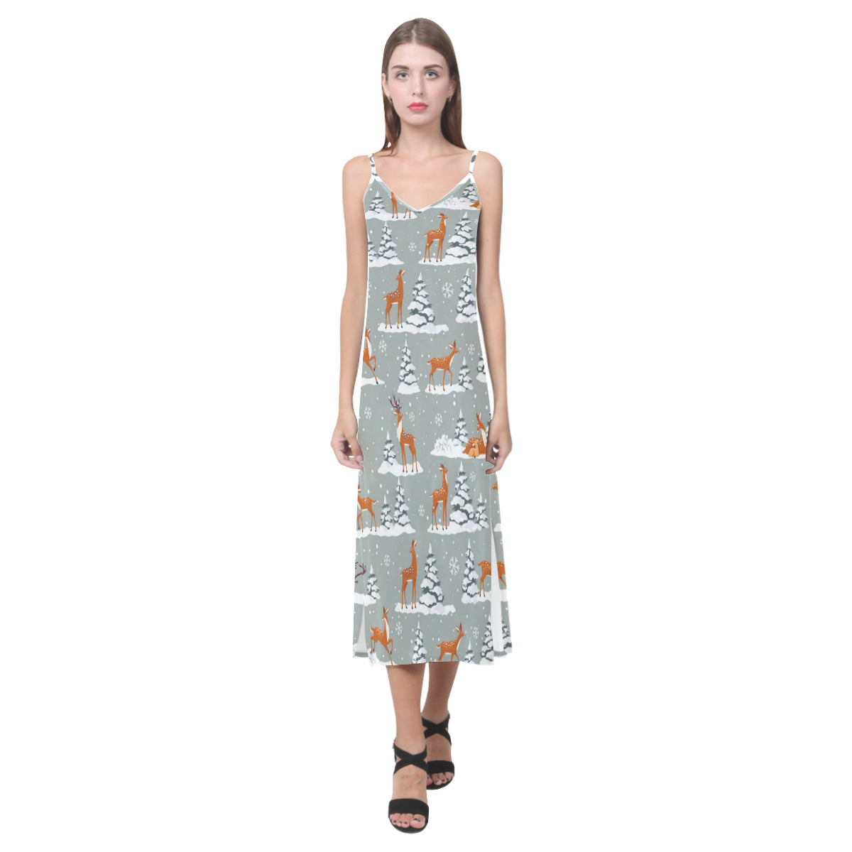 Beautiful deers Winter Christmas V-Neck Open Fork Long Dress