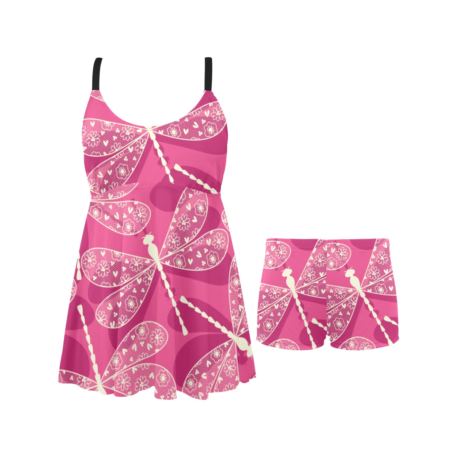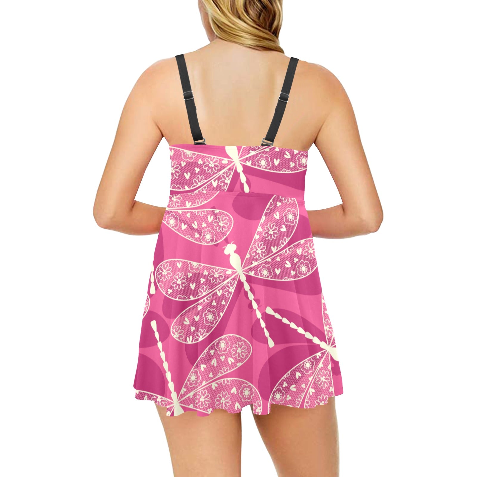 Beautiful dragonfly pink background Chest Sexy Pleated Two Piece Swim Dress