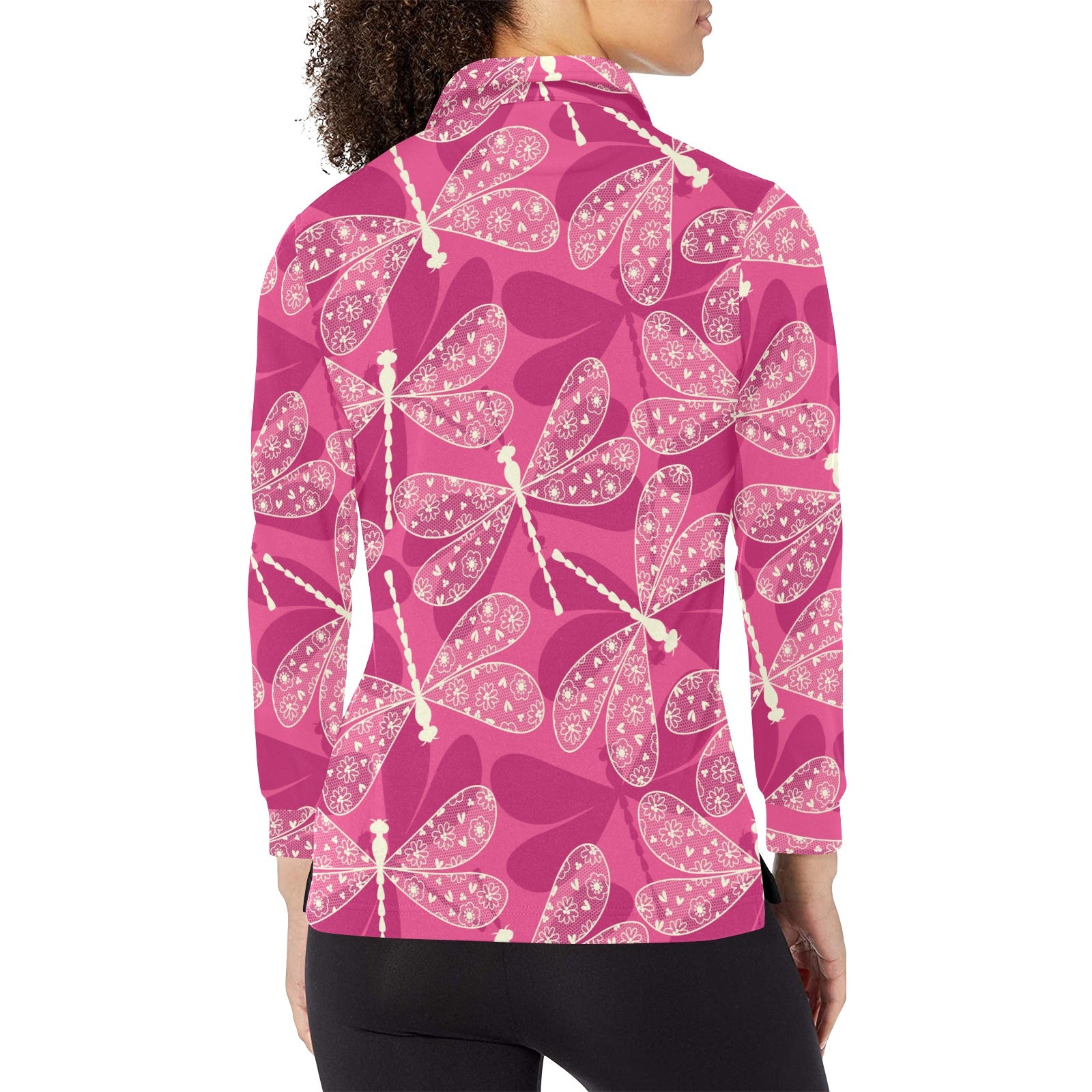 Beautiful dragonfly pink background Women's Long Sleeve Polo Shirt
