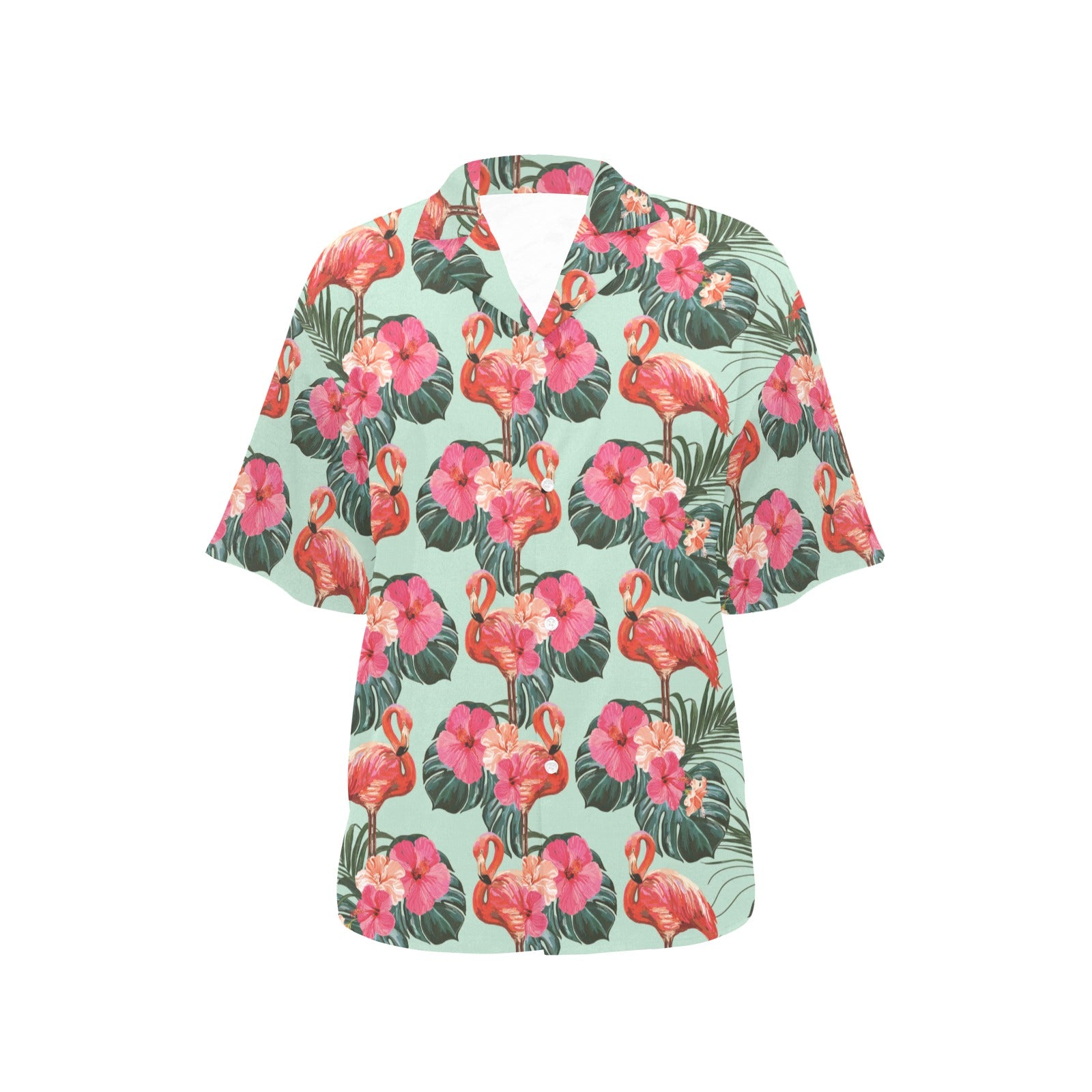 Beautiful flamingo tropical palm leaves hibiscus p Women's All Over Print Hawaiian Shirt