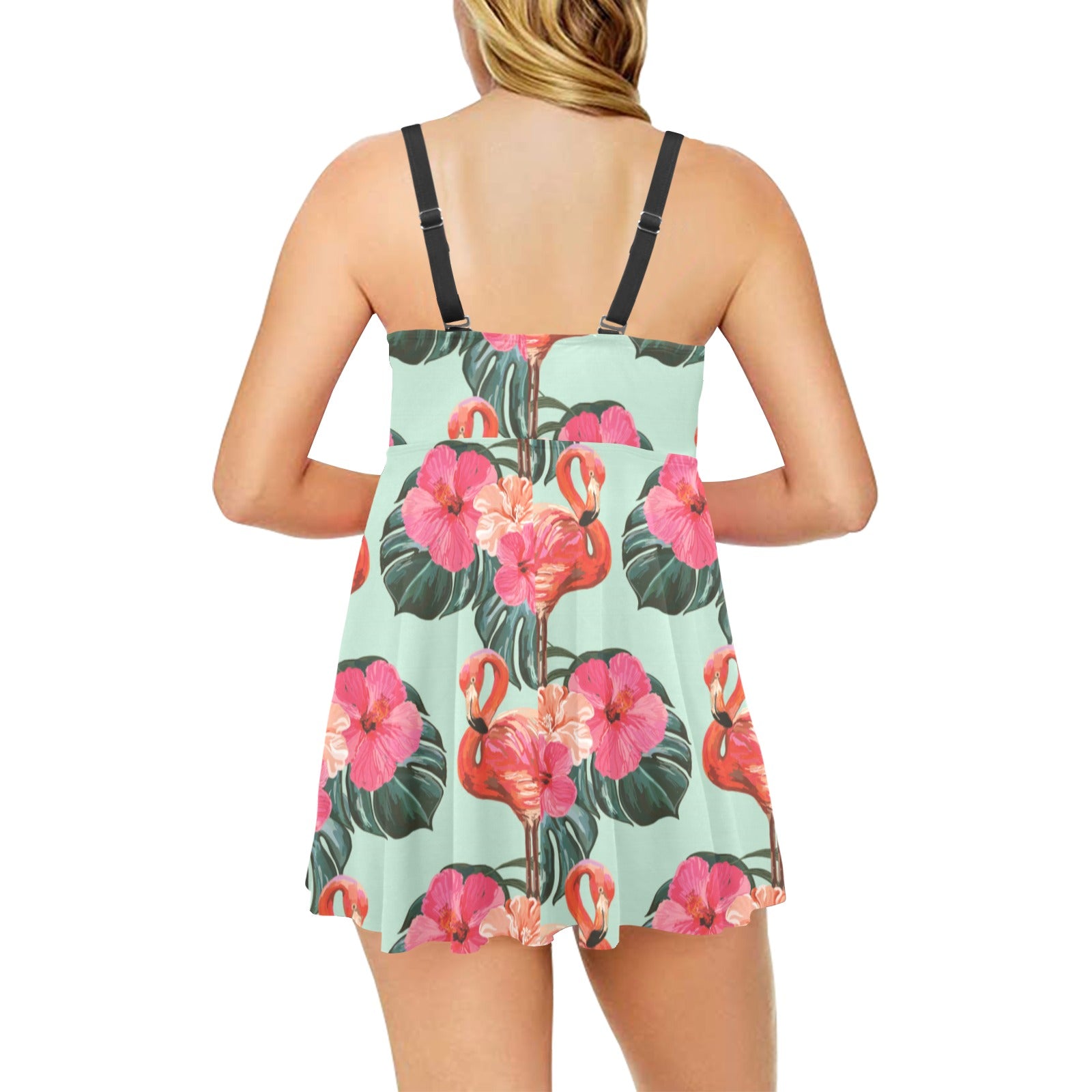Beautiful flamingo tropical palm leaves hibiscus p Chest Sexy Pleated Two Piece Swim Dress