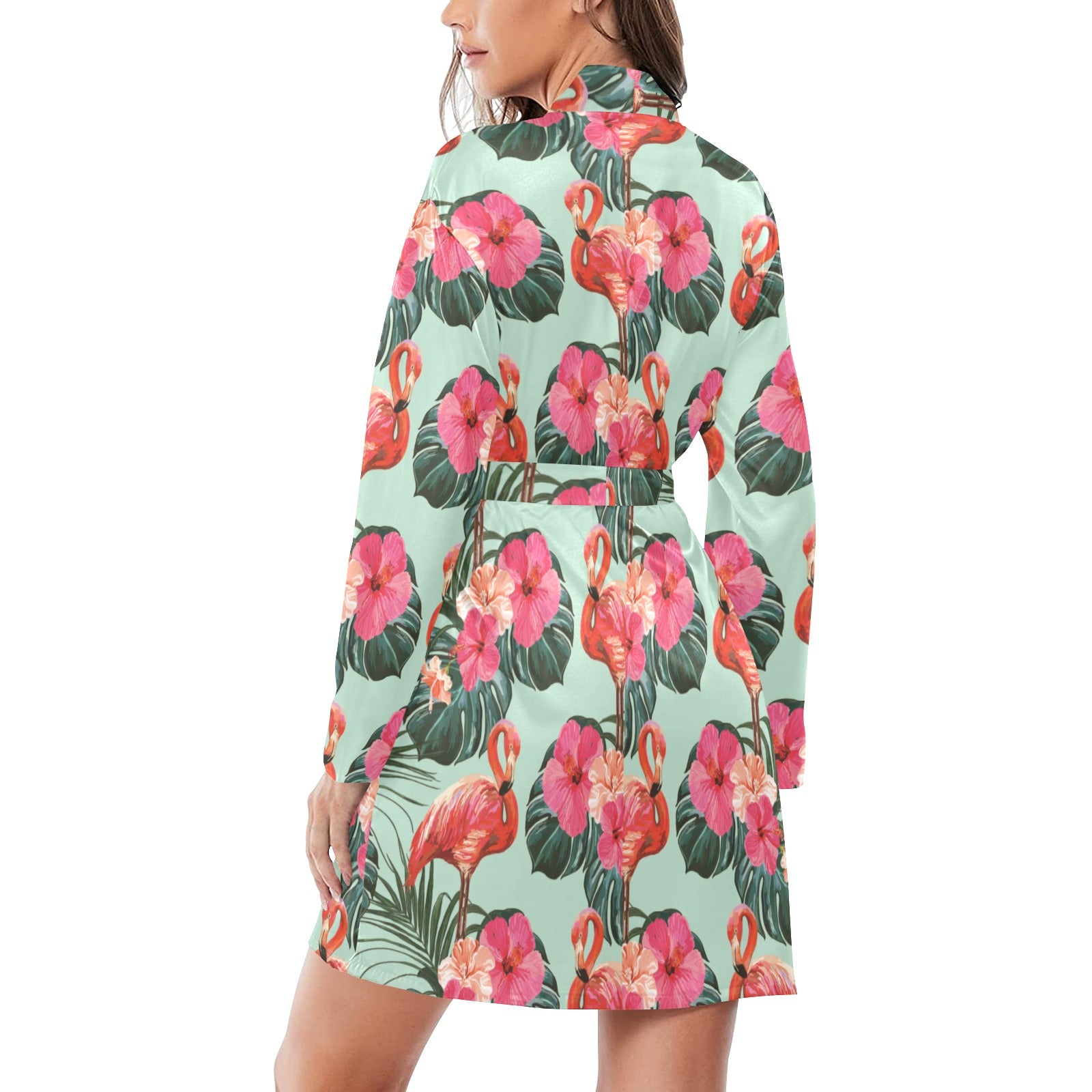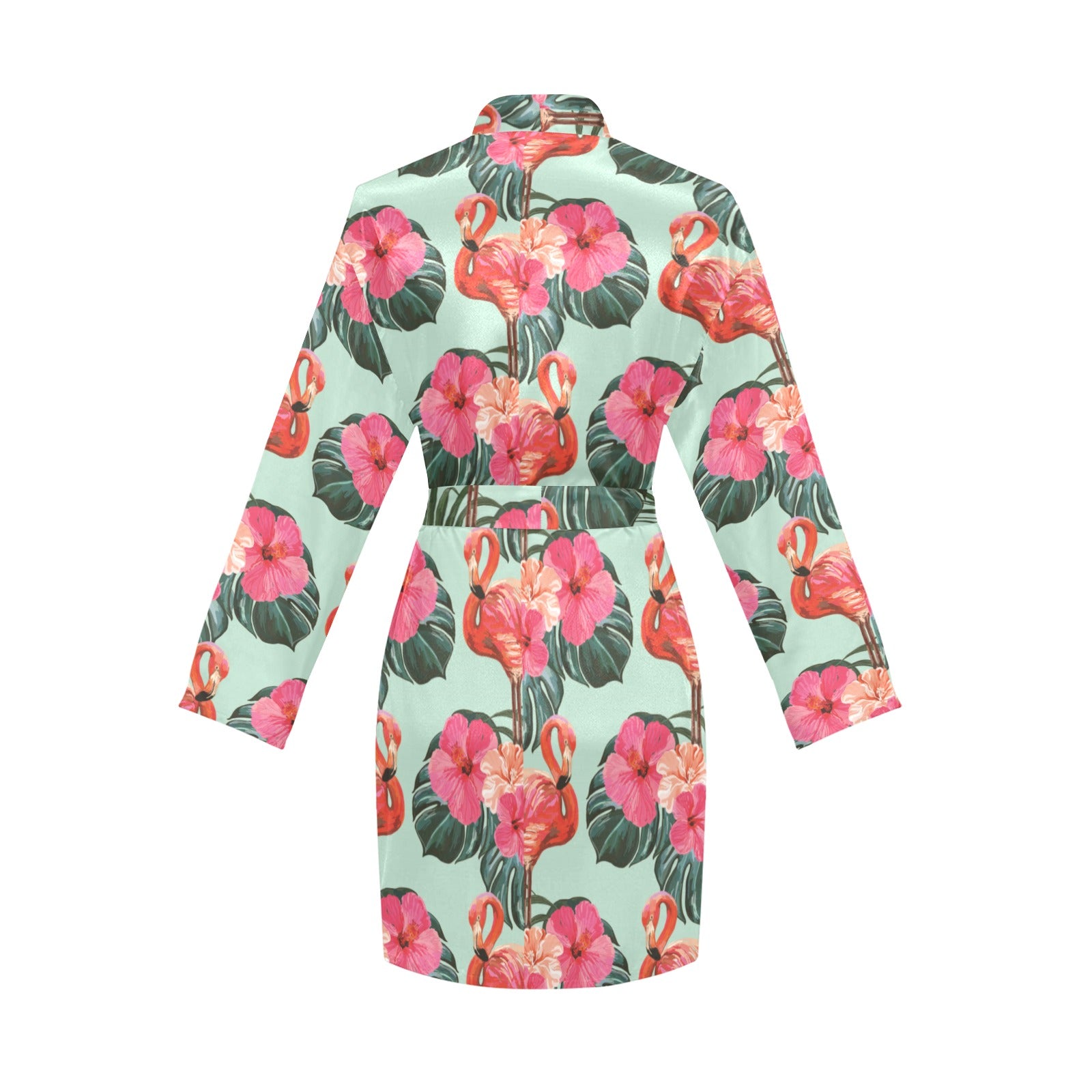 Beautiful flamingo tropical palm leaves hibiscus p Women's Long Sleeve Belted Night Robe