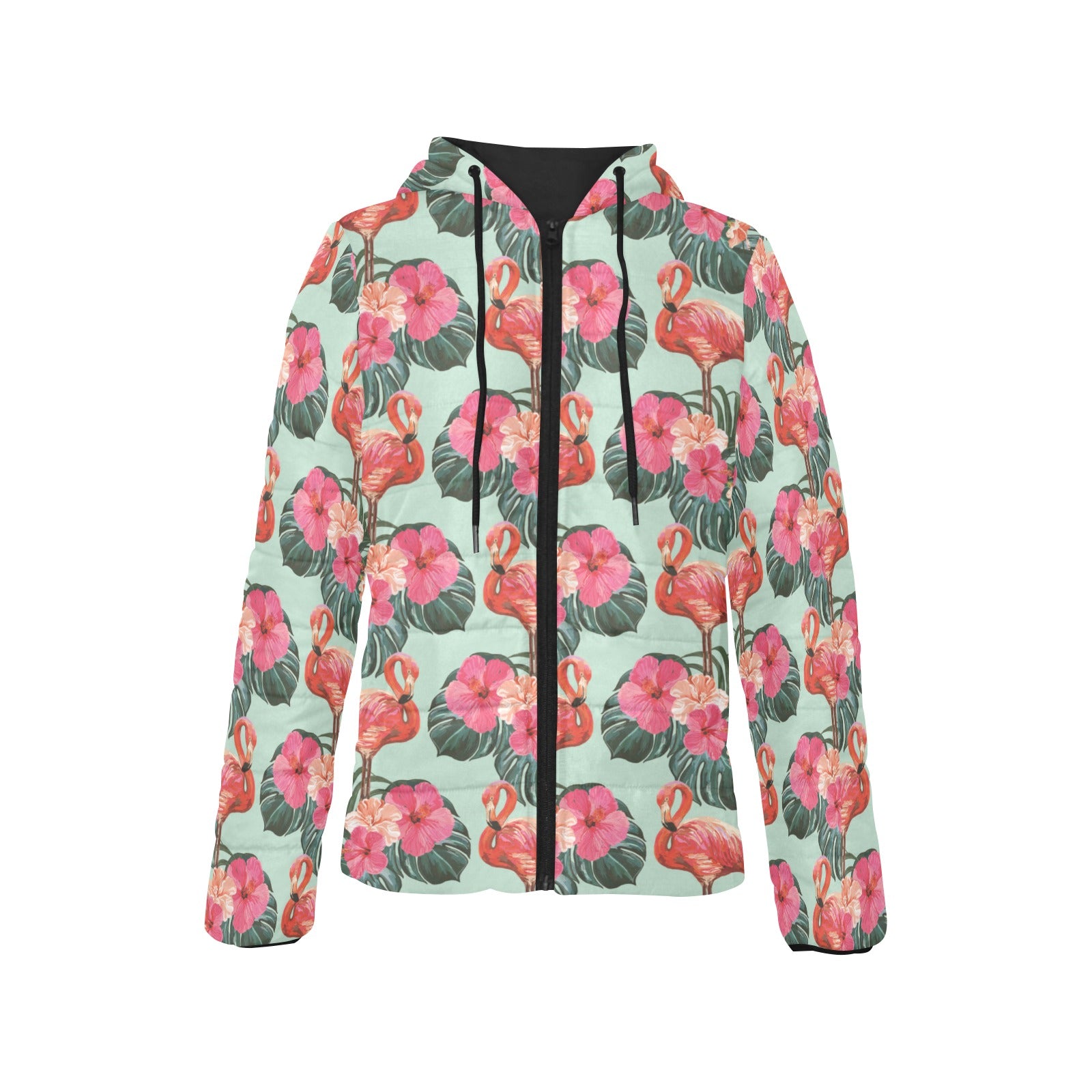 Beautiful flamingo tropical palm leaves hibiscus p Women's Padded Hooded Jacket