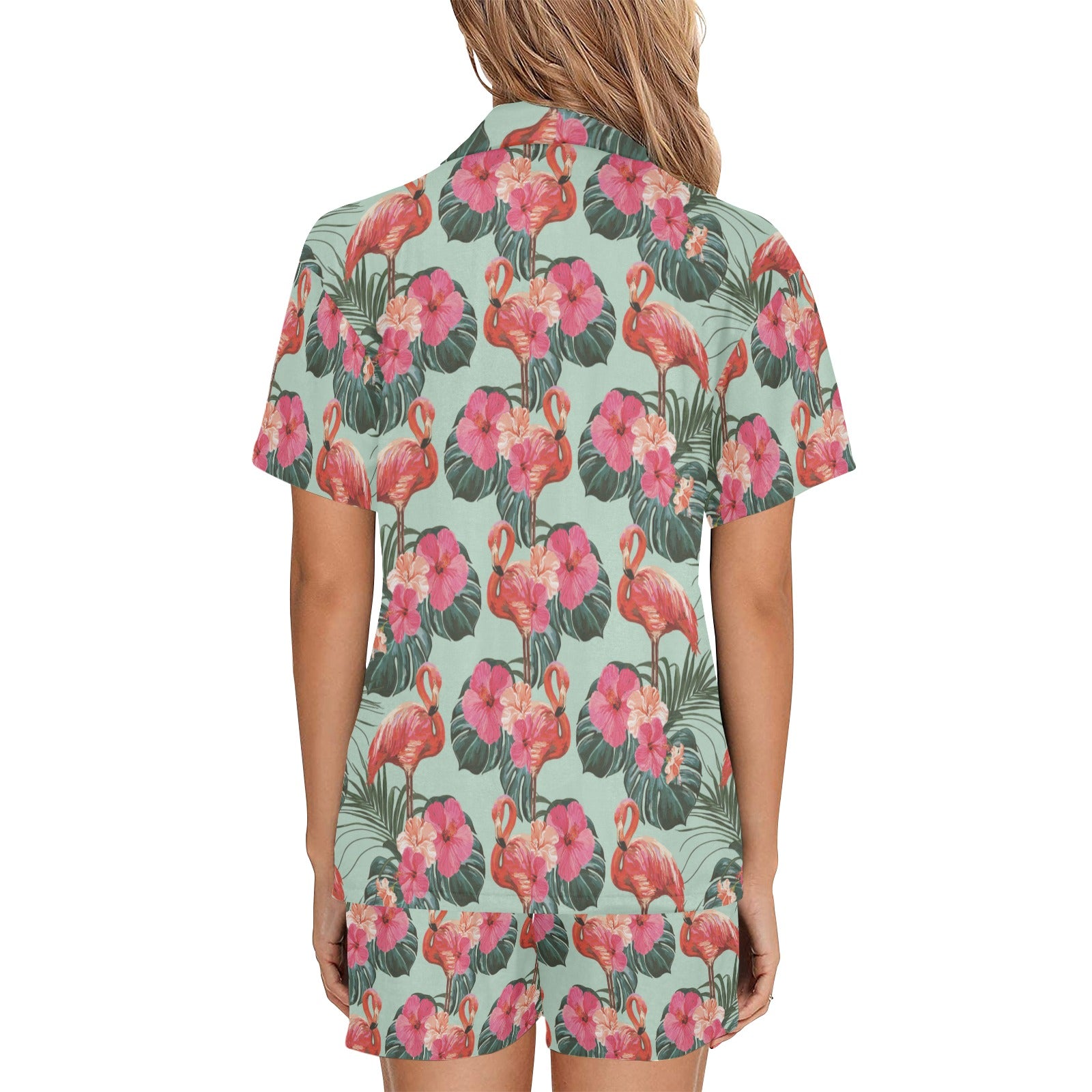 Beautiful flamingo tropical palm leaves hibiscus p Women's V-Neck Short Pajama Set