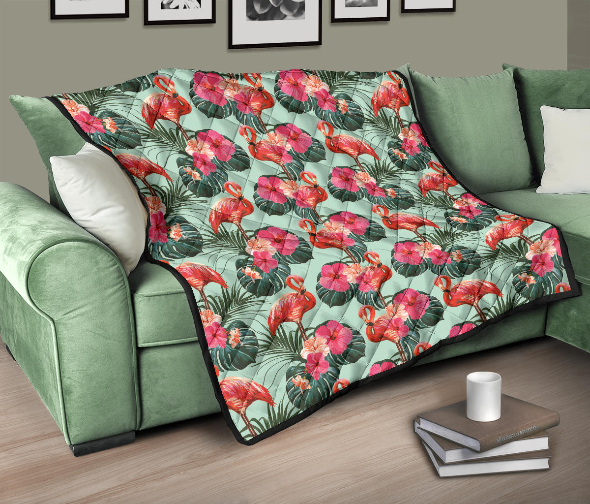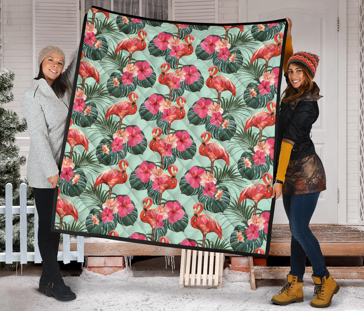 Beautiful Flamingo Tropical Palm Leaves Hibiscus Pateern Background Premium Quilt is a uniqued design and limited item. It made to order, hand printed, and sewn with love in our factory.