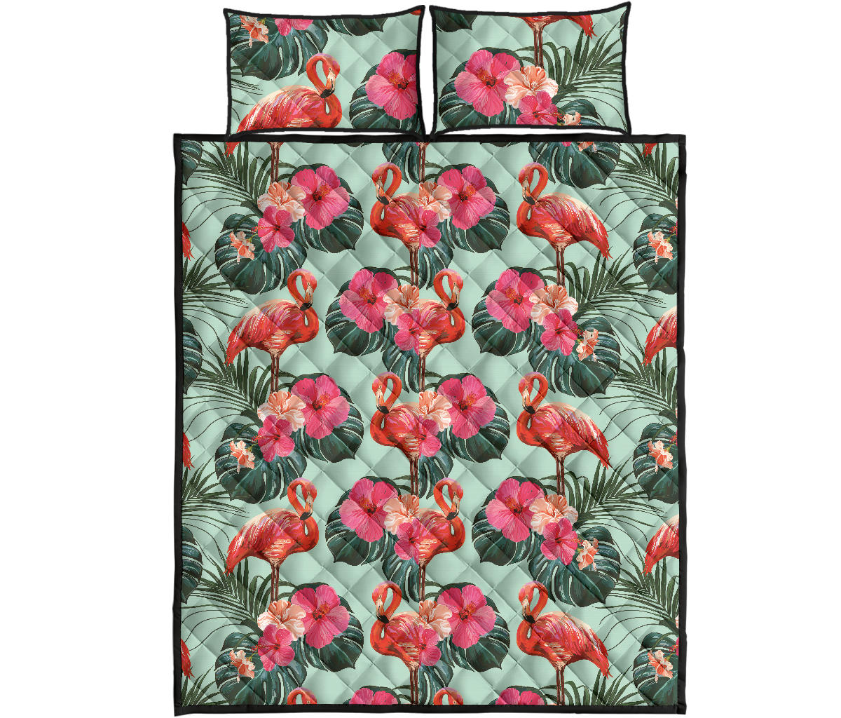 Beautiful flamingo tropical palm leaves hibiscus pateern background Quilt Bed Set