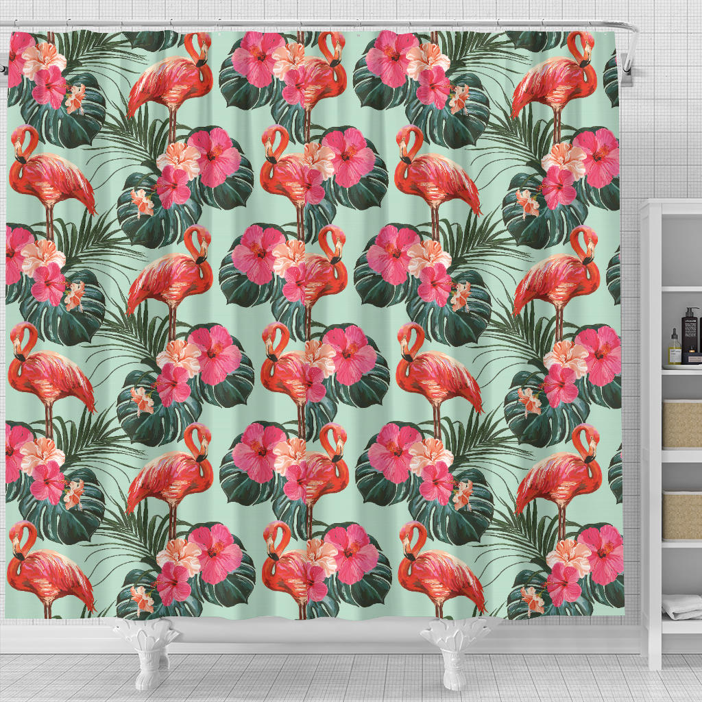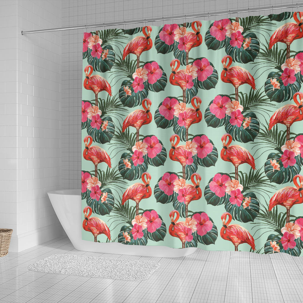 Beautiful Flamingo Tropical Palm Leaves Hibiscus Pateern Background Shower Curtain Fulfilled In US