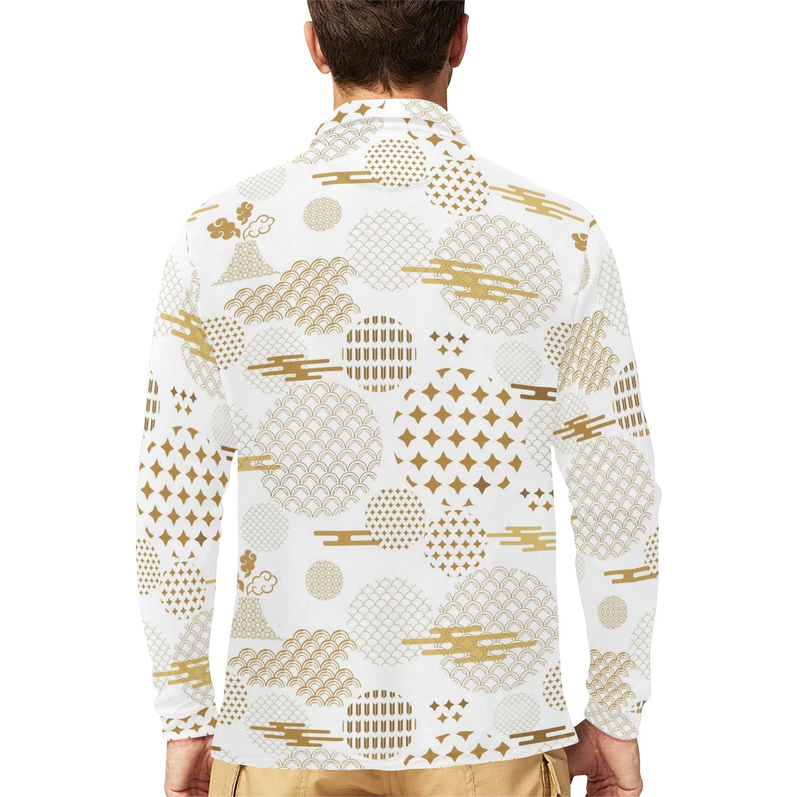 Beautiful gold japanese pattern Men's Long Sleeve Polo Shirt