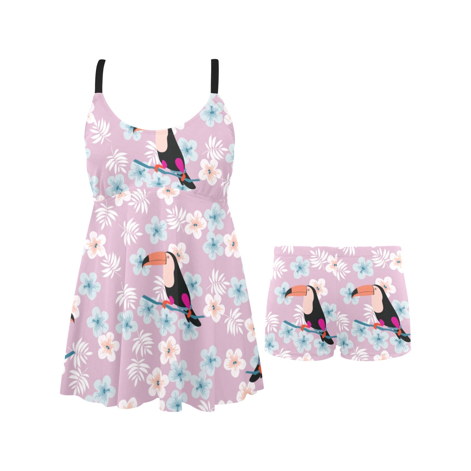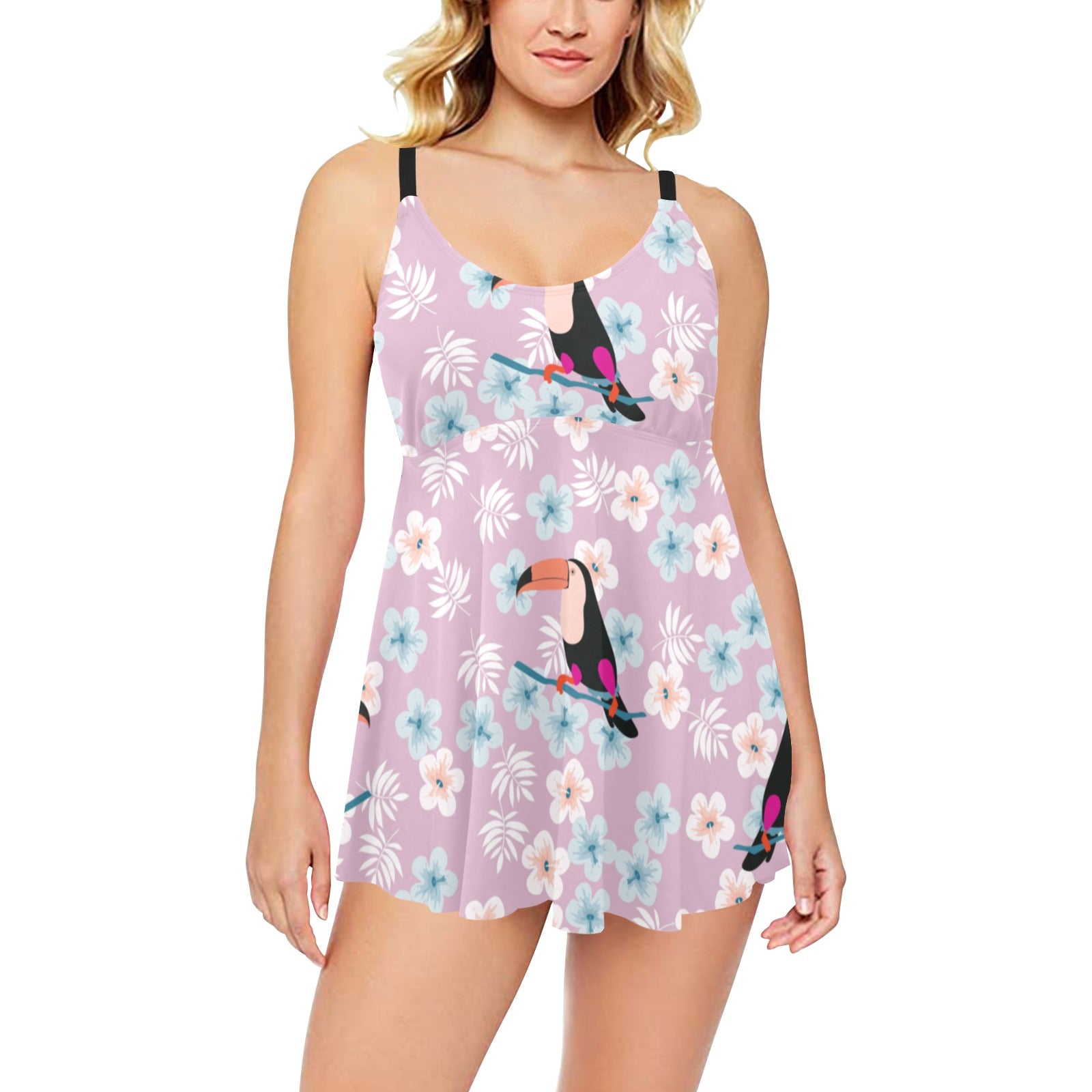 Beautiful toucan flower leaves Chest Sexy Pleated Two Piece Swim Dress