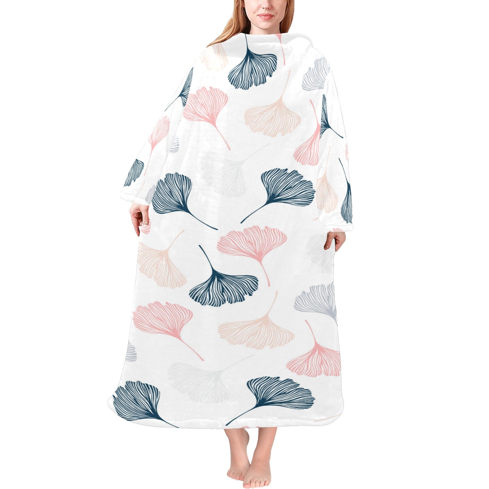 Black Gray Cream coral ginkgo leaves pattern Blanket Robe with Sleeves