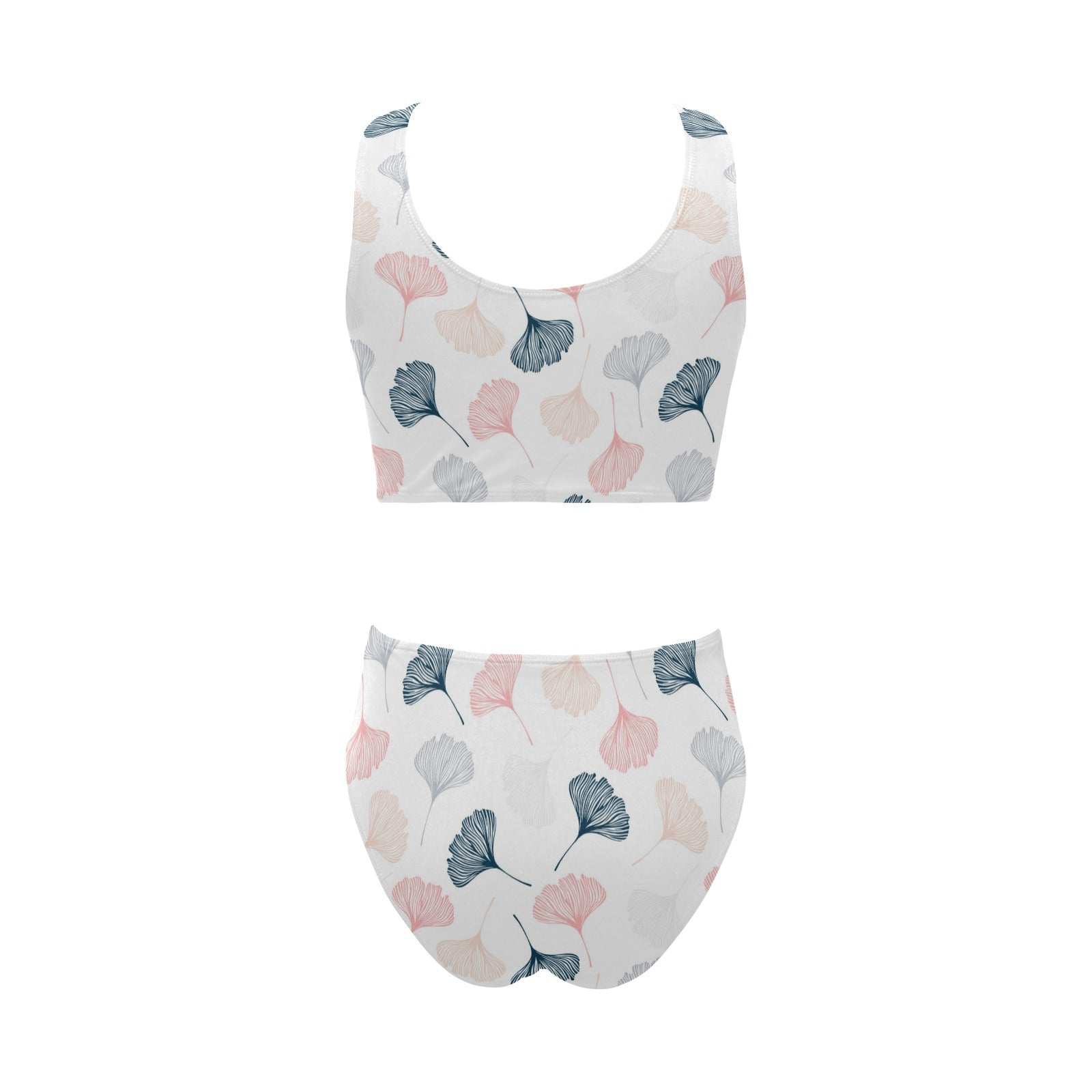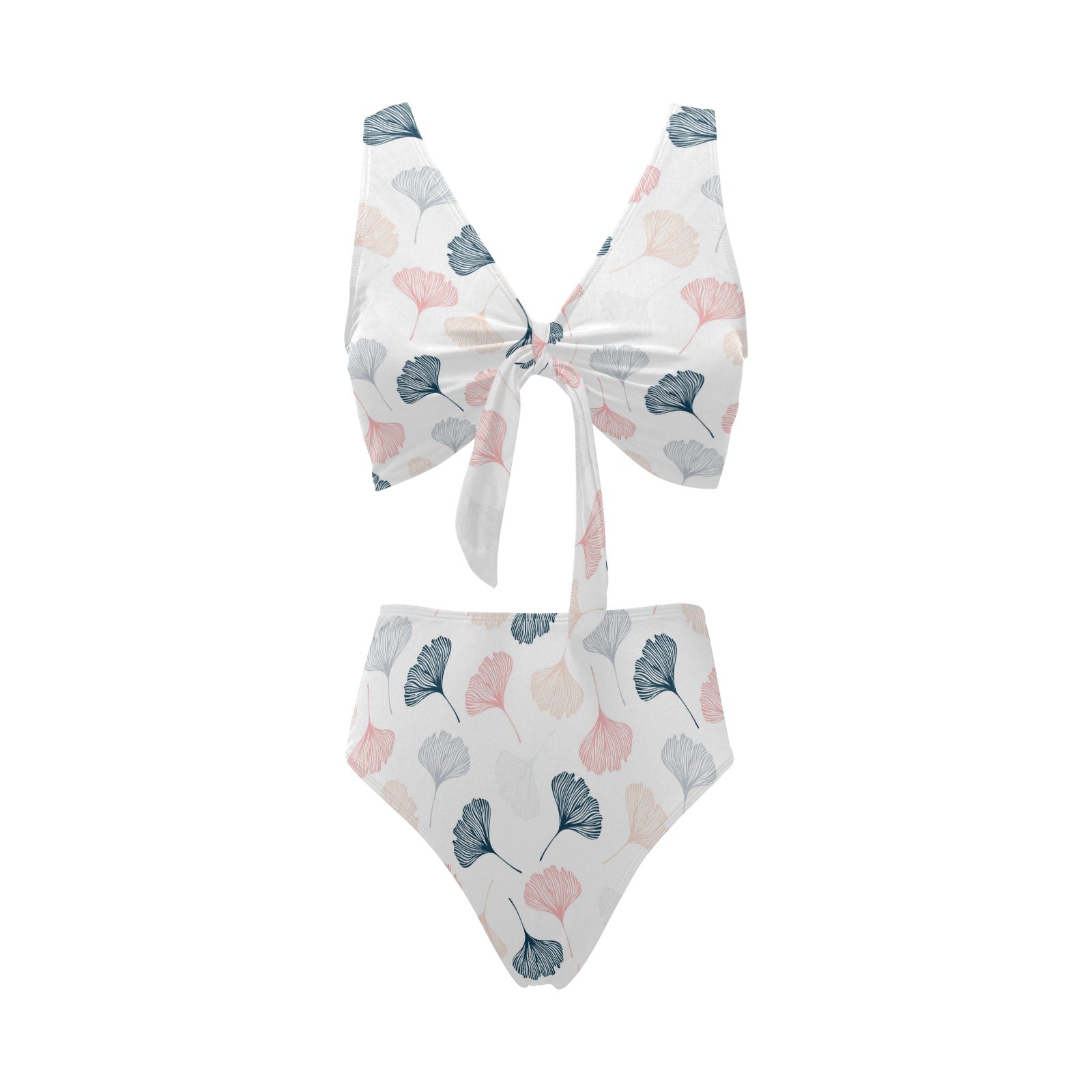 Black Gray Cream coral ginkgo leaves pattern Chest Bowknot High Waisted Bikini Swimsuit