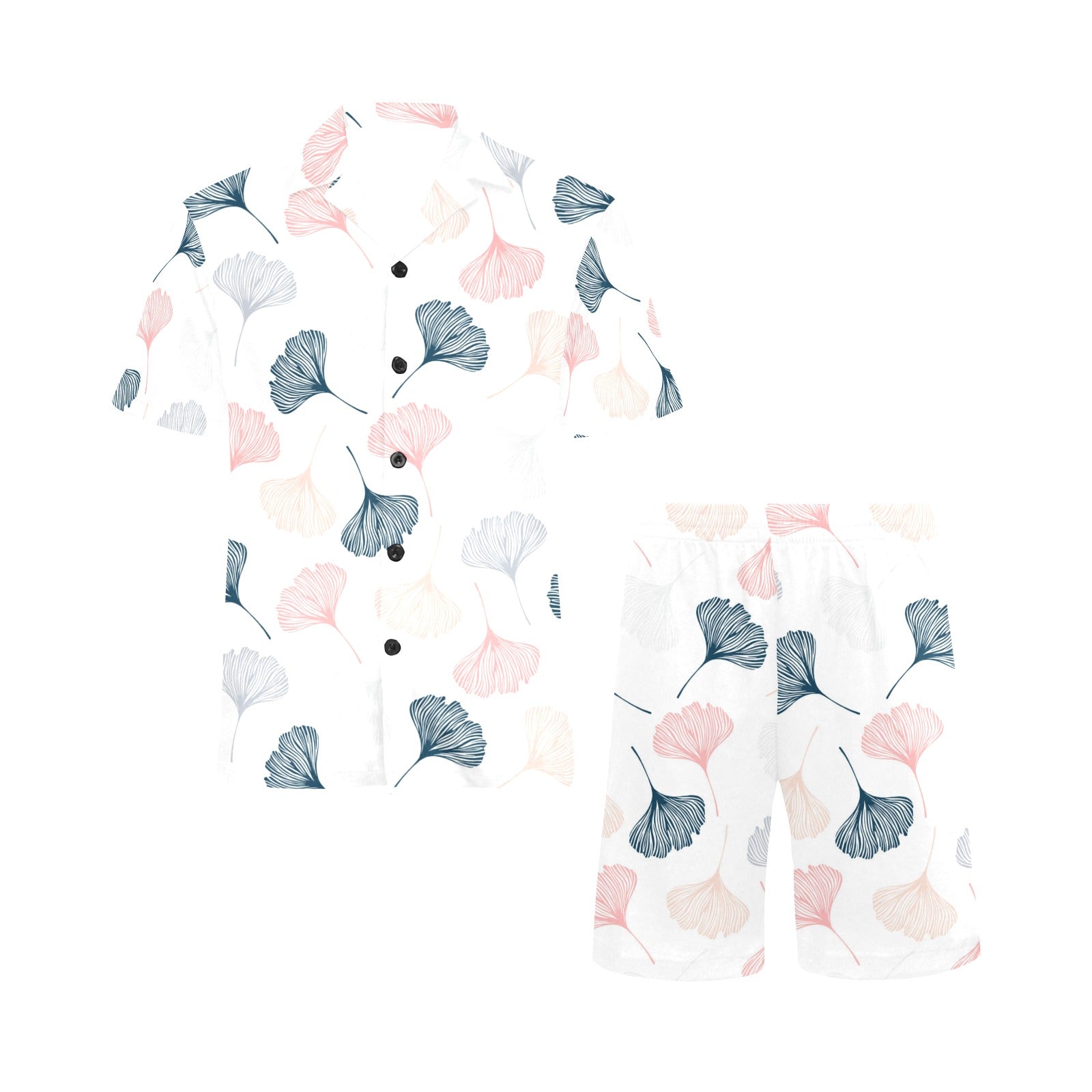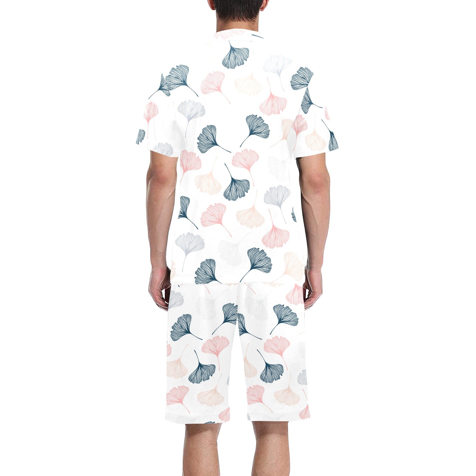 Black Gray Cream coral ginkgo leaves pattern Men's V-Neck Short Pajama Set
