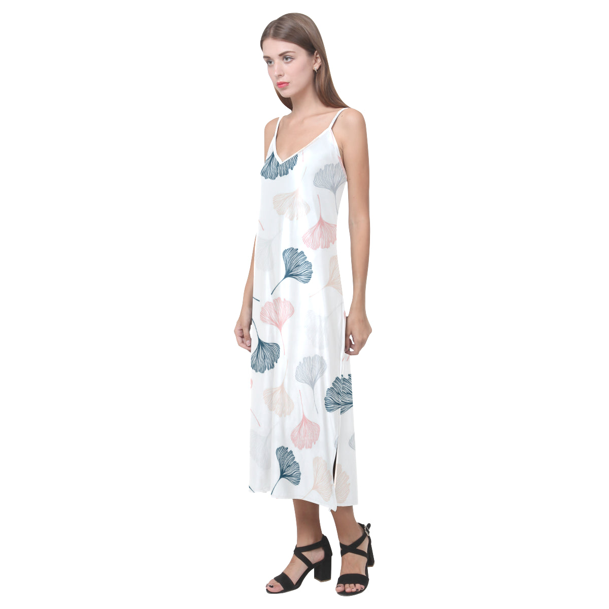 Black Gray Cream coral ginkgo leaves pattern V-Neck Open Fork Long Dress is a uniqued design and limited item. It made to order, hand printed, and sewn with love in our factory.