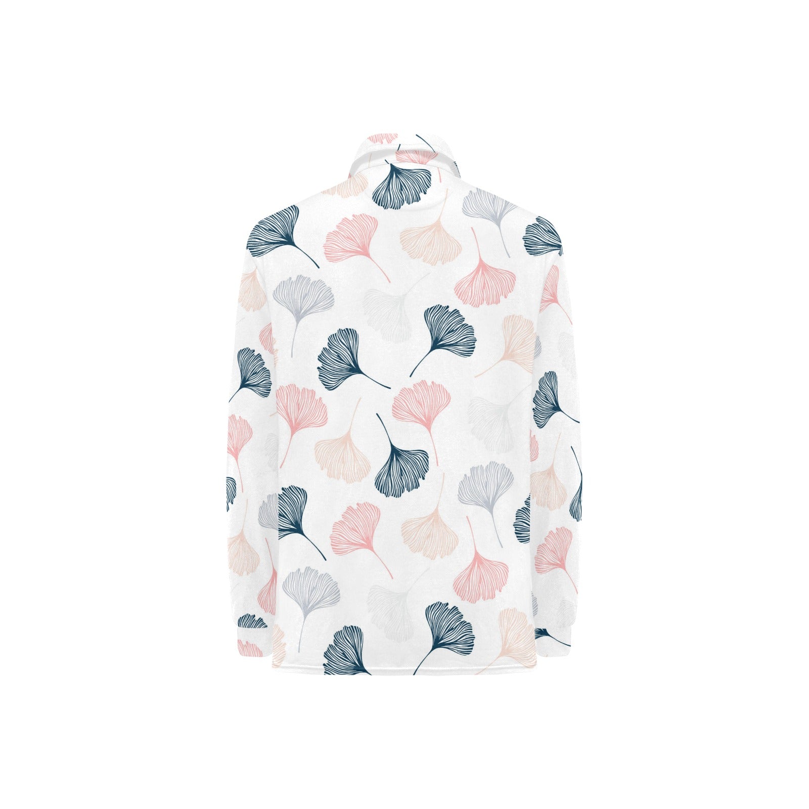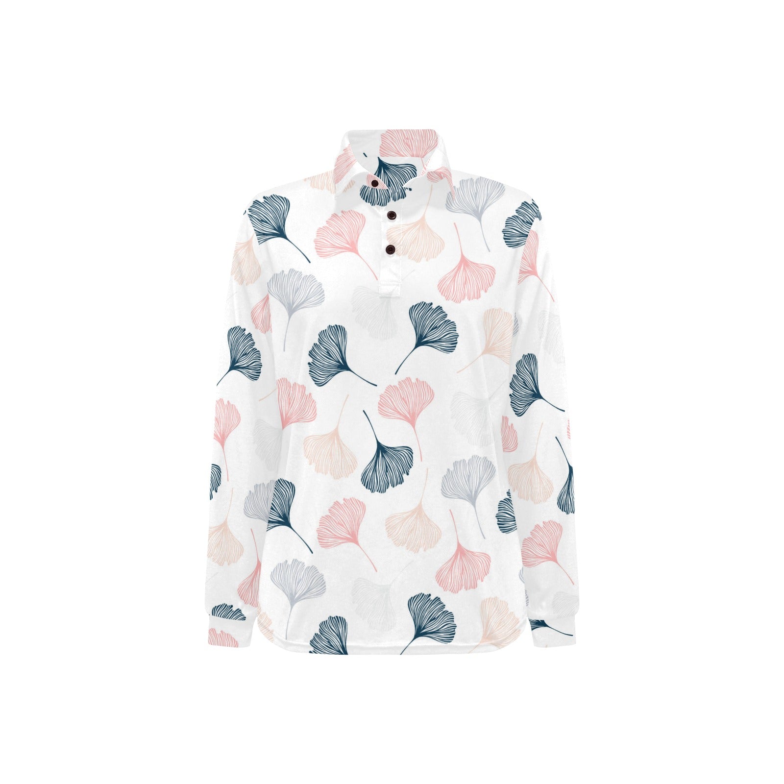 Black Gray Cream coral ginkgo leaves pattern Women's Long Sleeve Polo Shirt