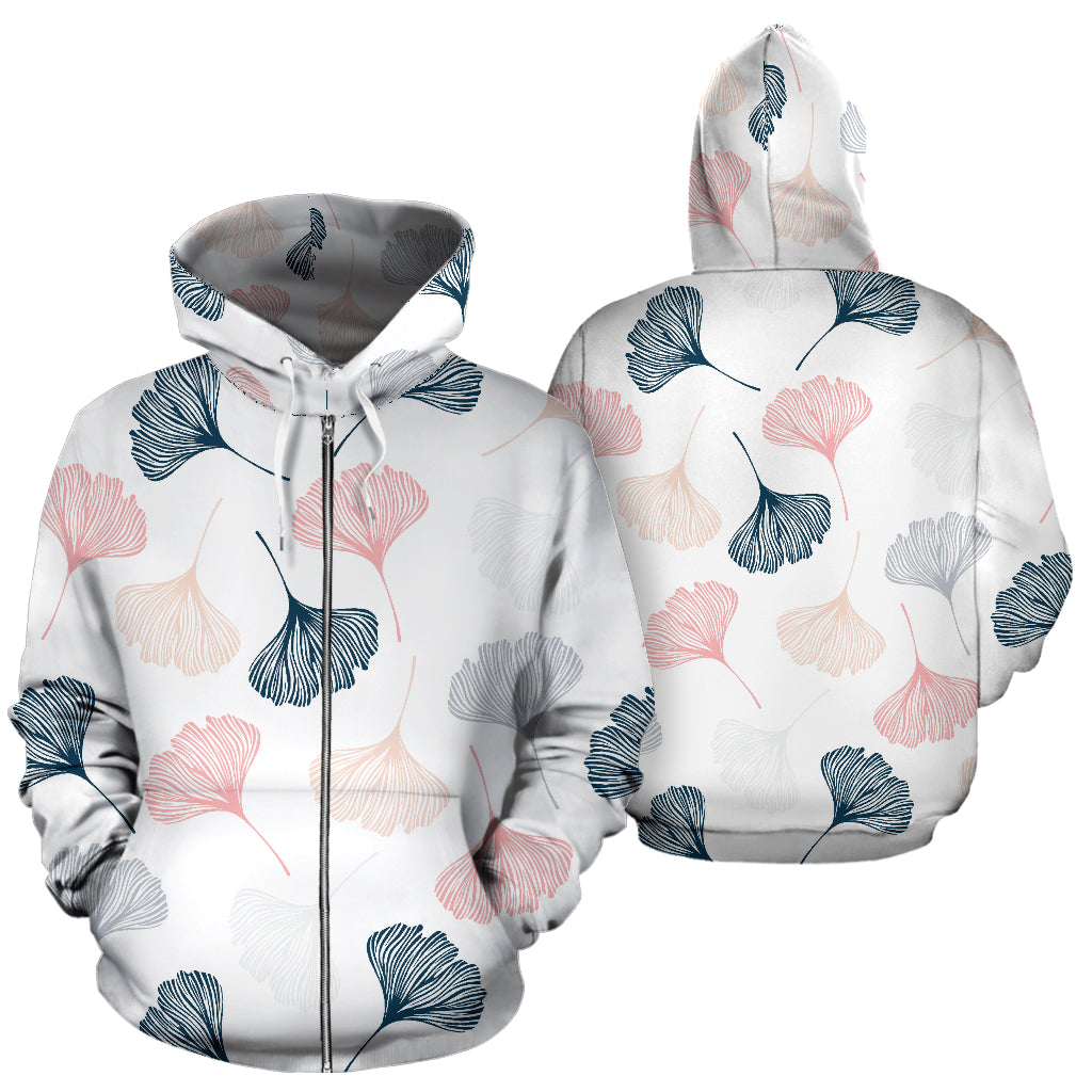 Black Gray Cream Coral Ginkgo Leaves Pattern Zip Up Hoodie
