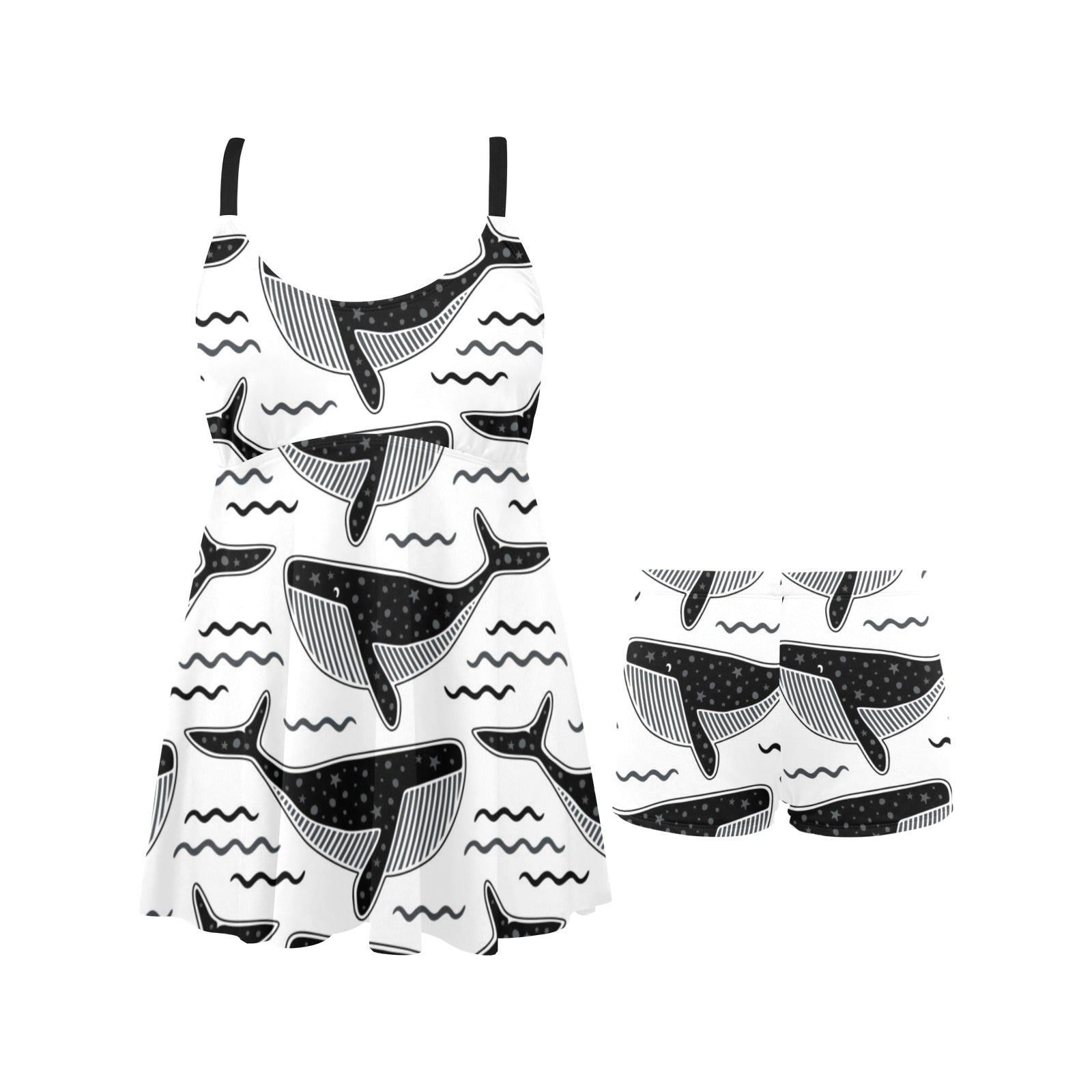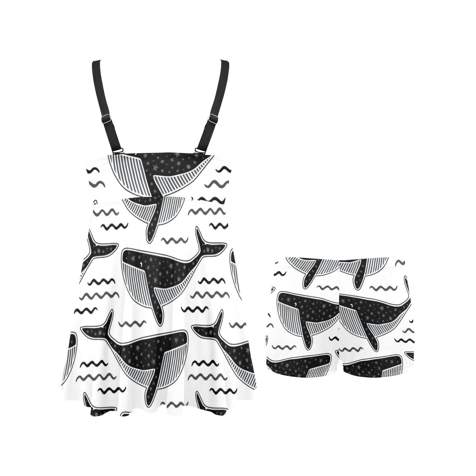 Black whale pattern Chest Sexy Pleated Two Piece Swim Dress