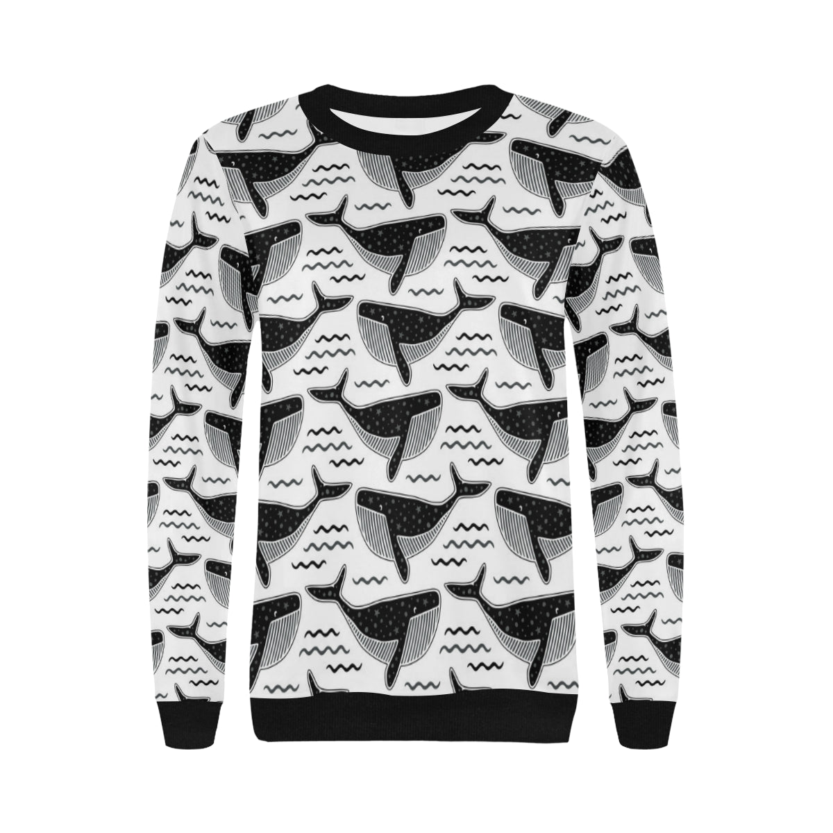 Black whale pattern Women's Crew Neck Sweatshirt is a uniqued design and limited item. It made to order, hand printed, and sewn with love in our factory.