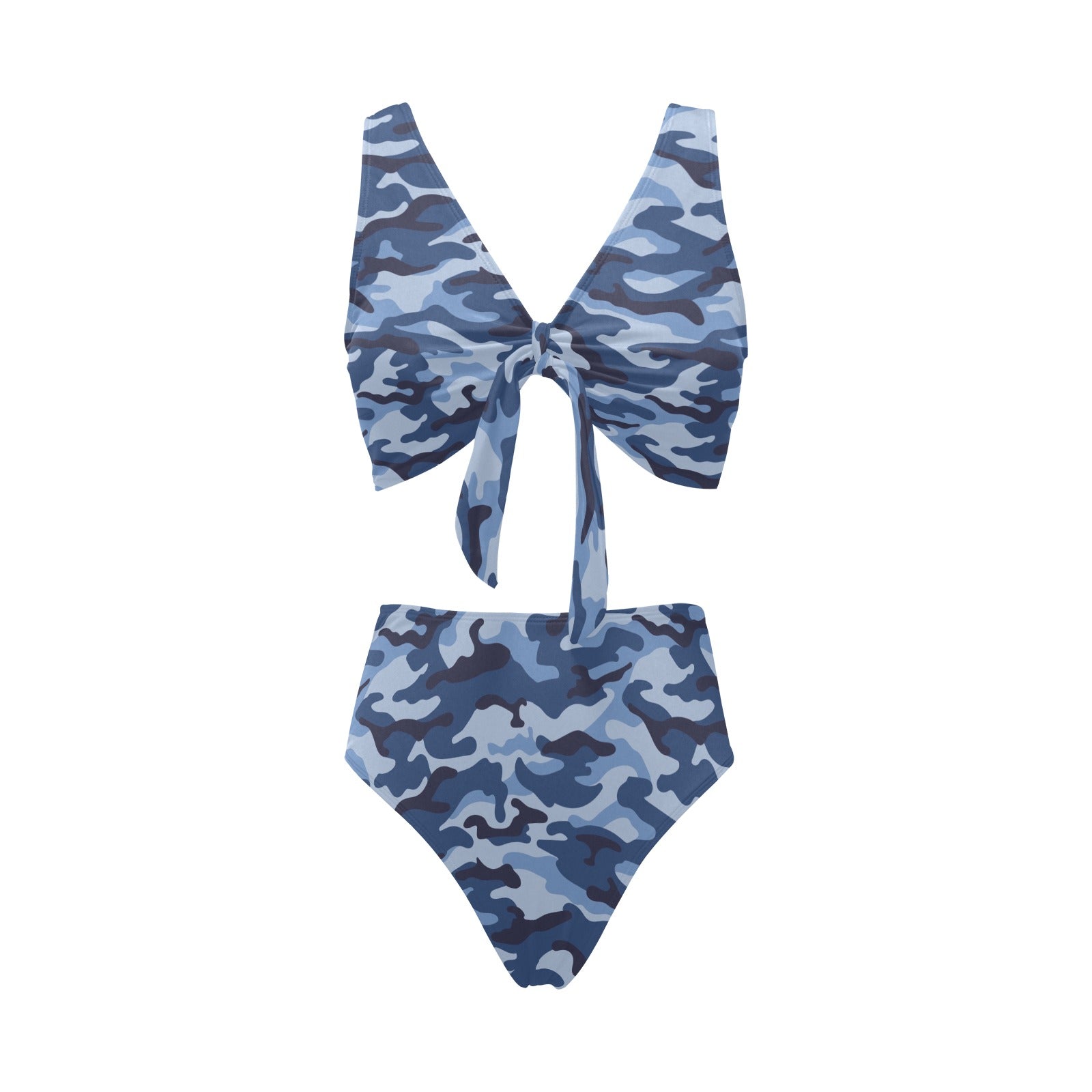 Blue camouflage pattern Chest Bowknot High Waisted Bikini Swimsuit