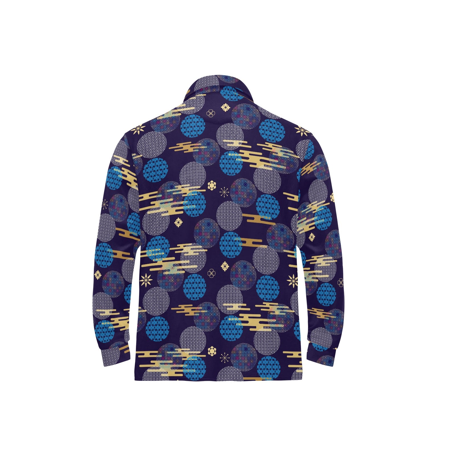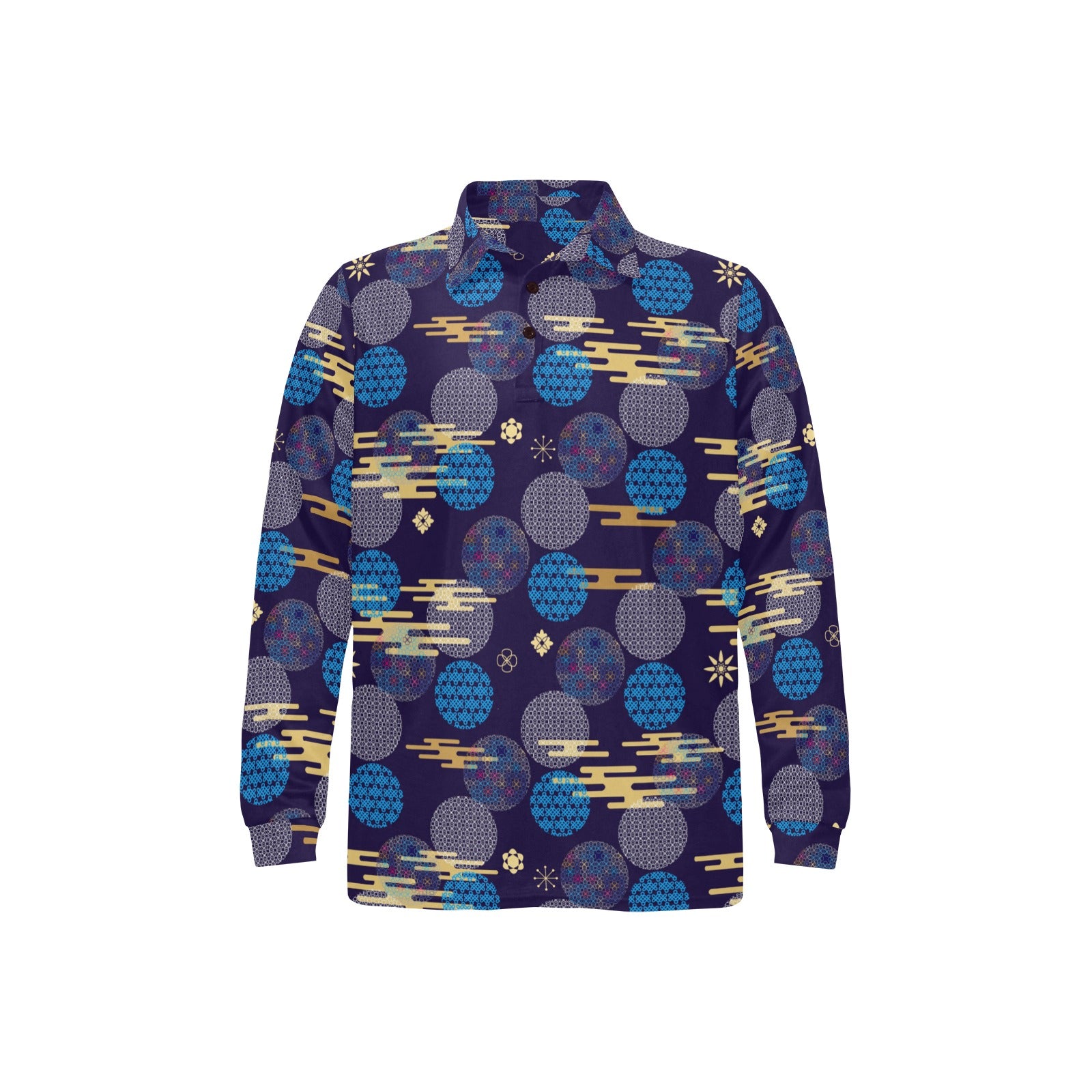 Blue japanese pattern cloud wave flower Men's Long Sleeve Polo Shirt