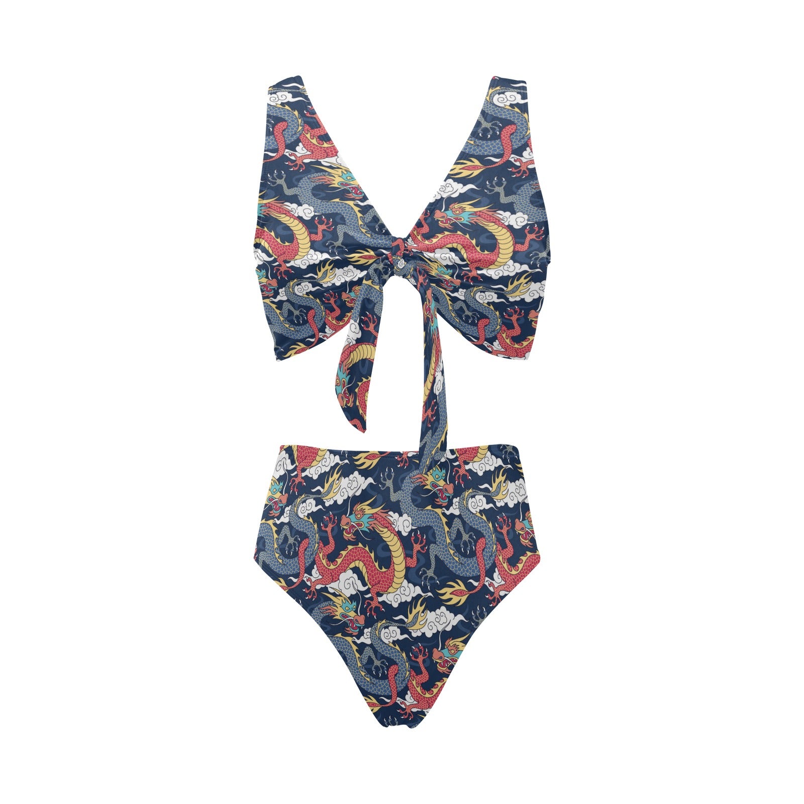 Blue red dragon cloud pattern Chest Bowknot High Waisted Bikini Swimsuit