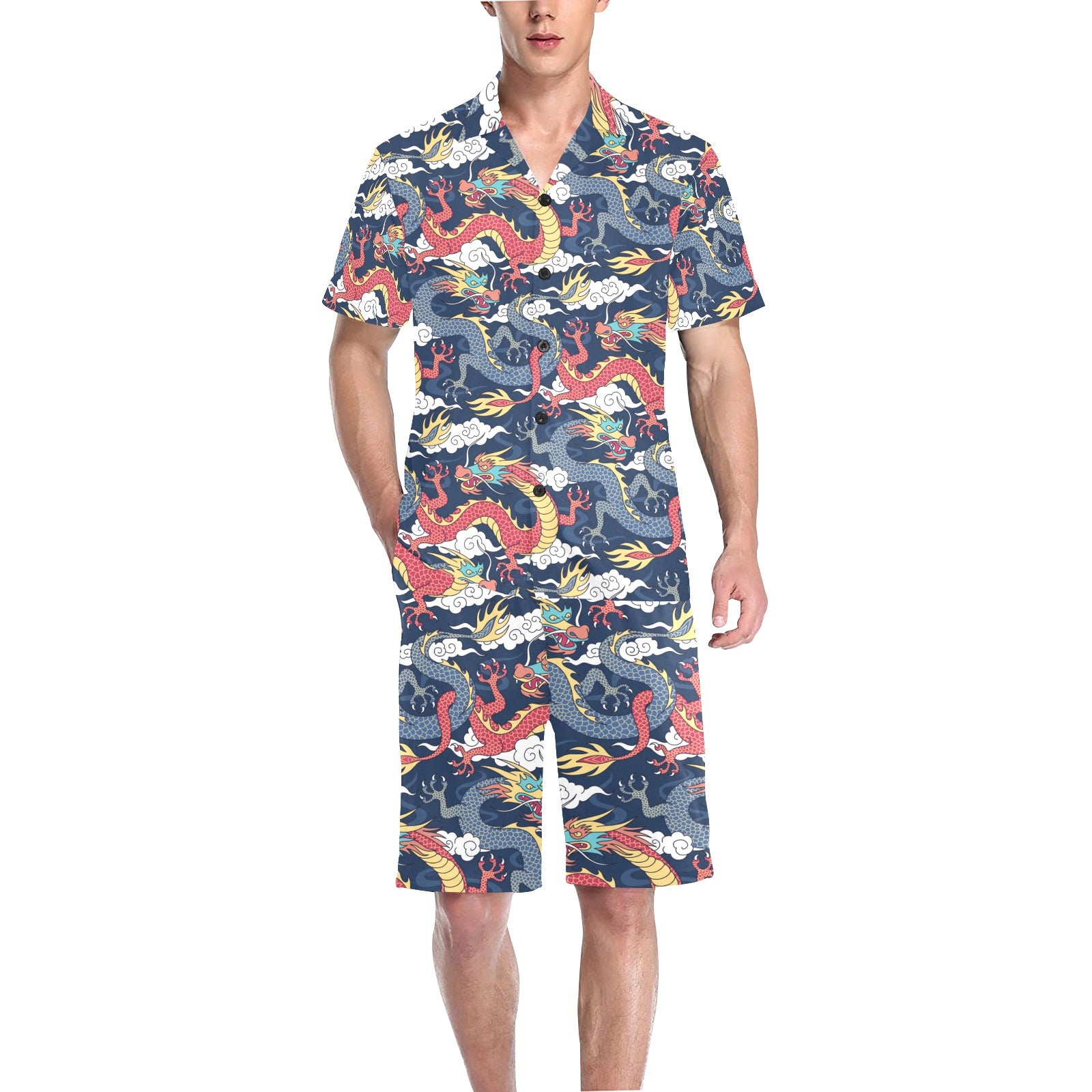 Blue red dragon cloud pattern Men's V-Neck Short Pajama Set