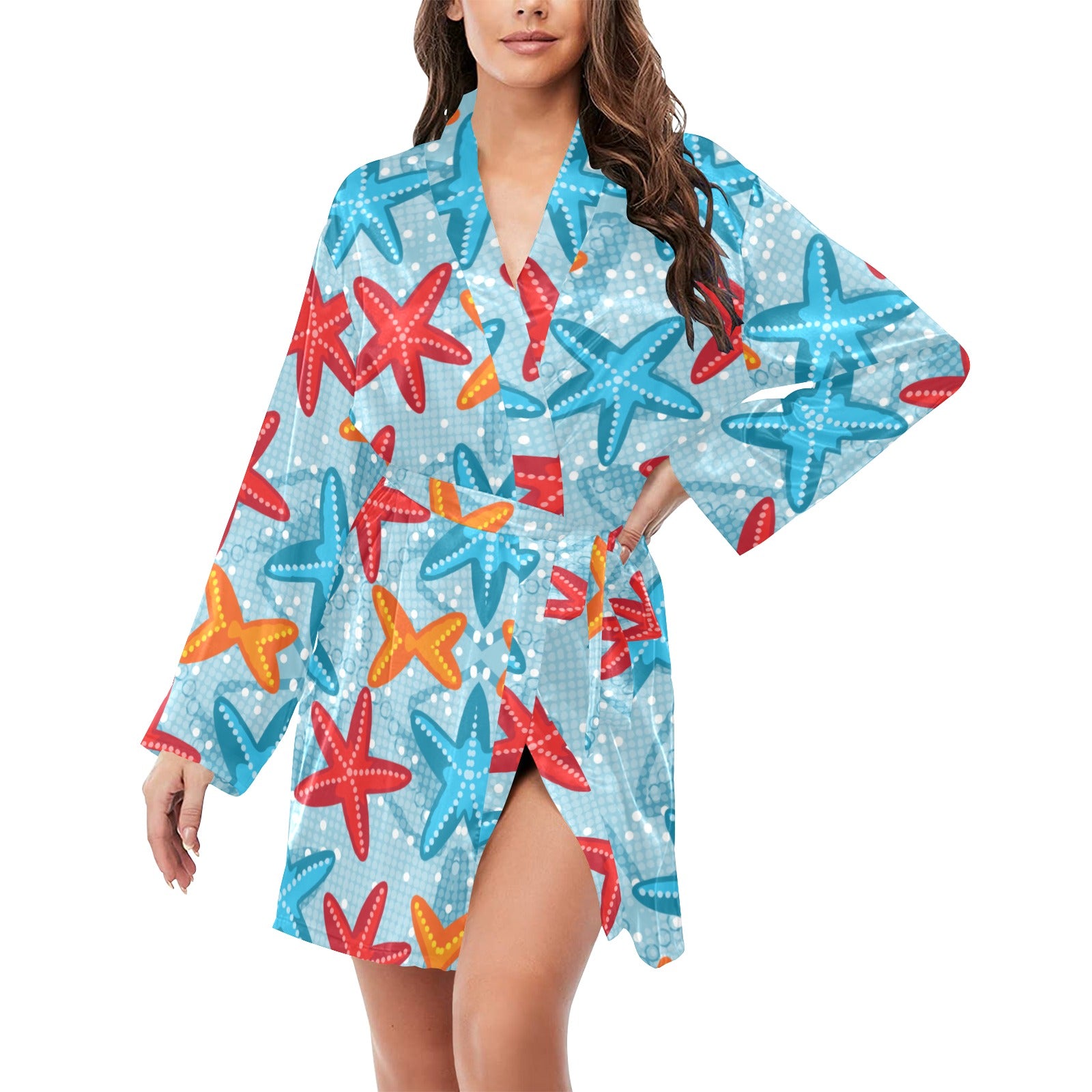 Blue red orange starfish pattern Women's Long Sleeve Belted Night Robe