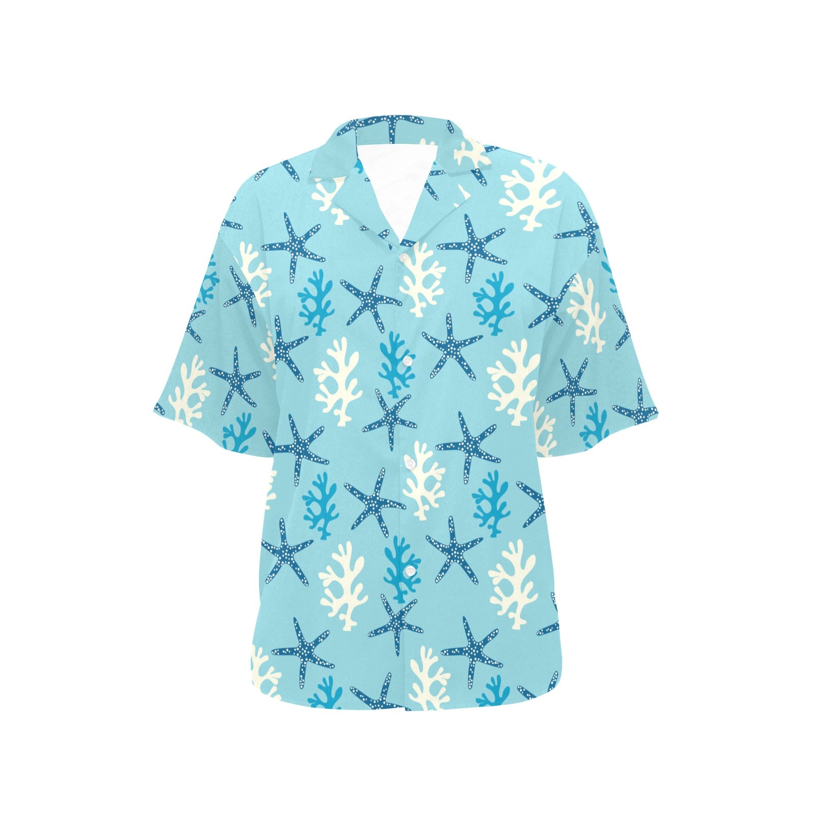 Blue starfish coral reef pattern Women's All Over Print Hawaiian Shirt