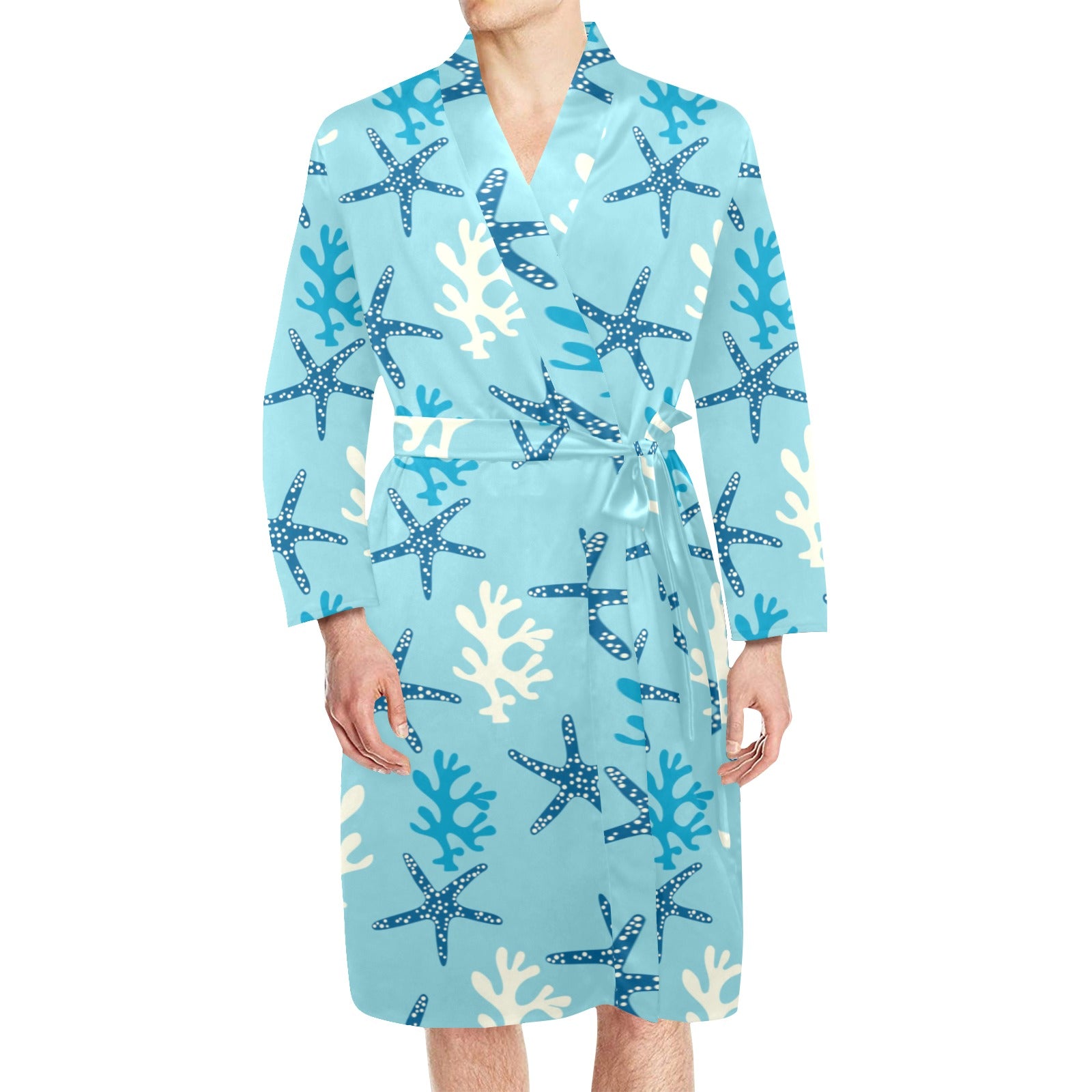 Blue starfish coral reef pattern Men's Long Sleeve Belted Night Robe