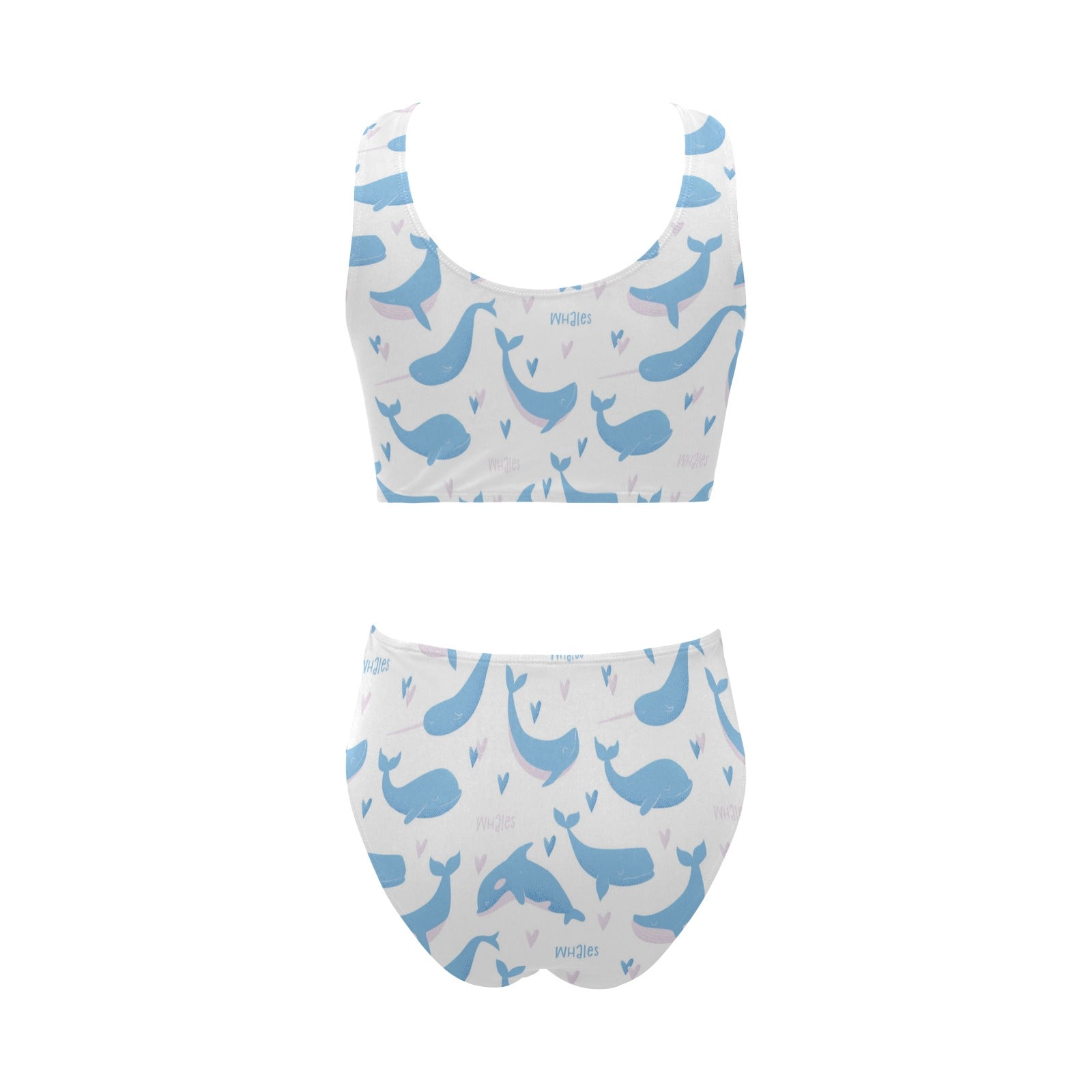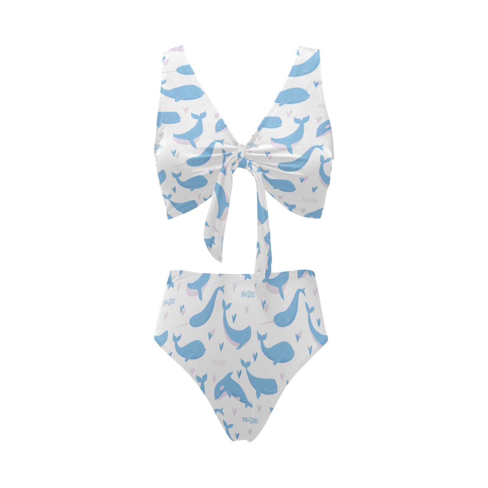 Blue whale pattern Chest Bowknot High Waisted Bikini Swimsuit