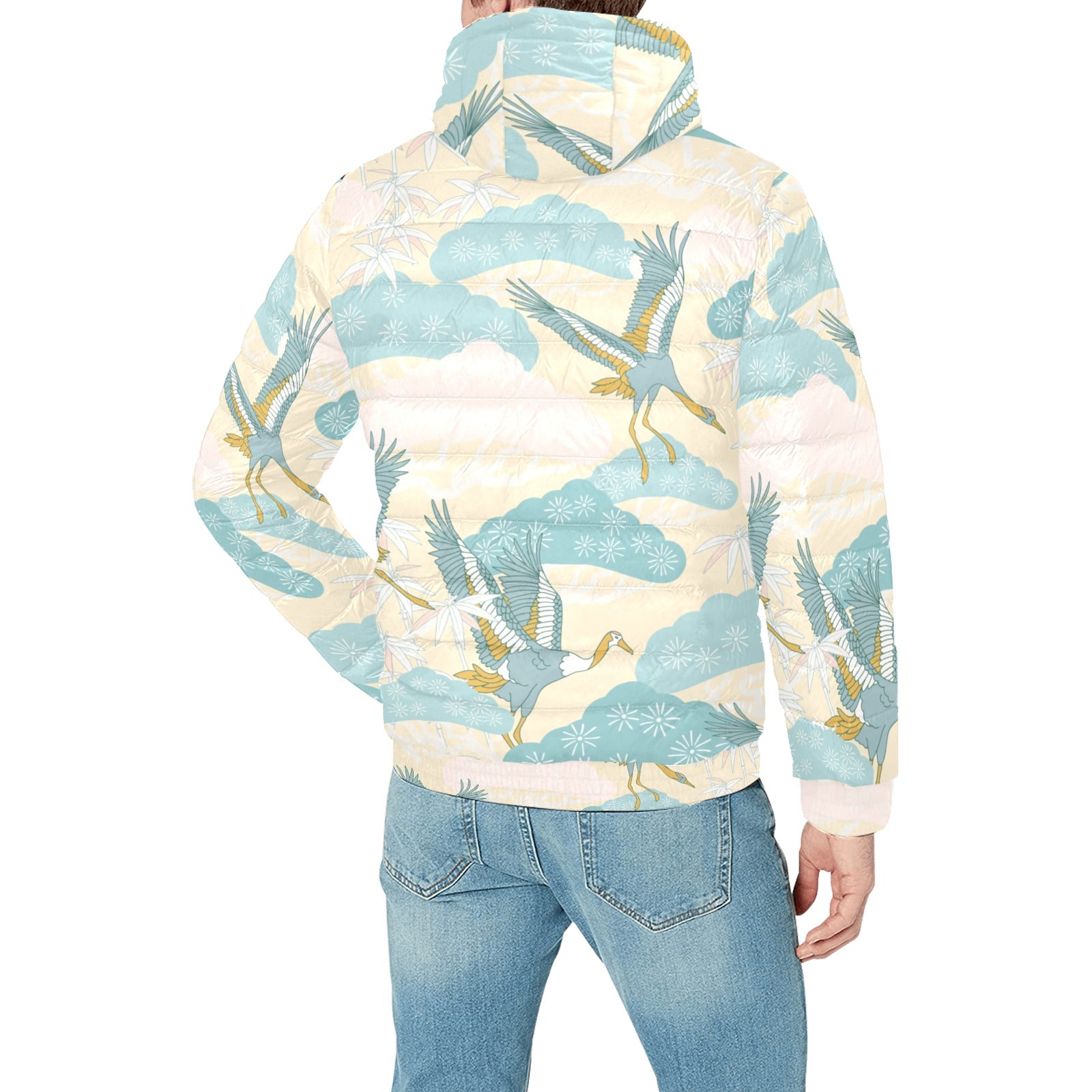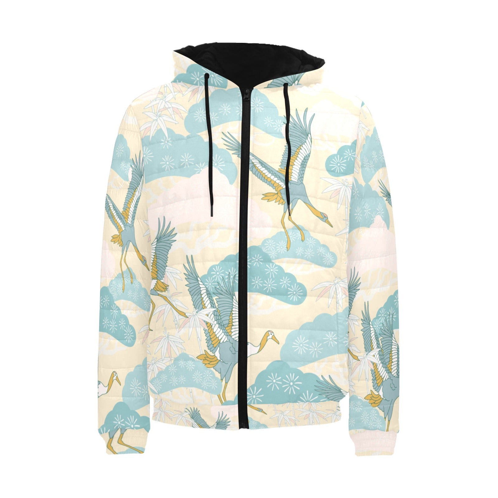 Bonsai bamboo stork japanese pattern cream theme Men's Padded Hooded Jacket