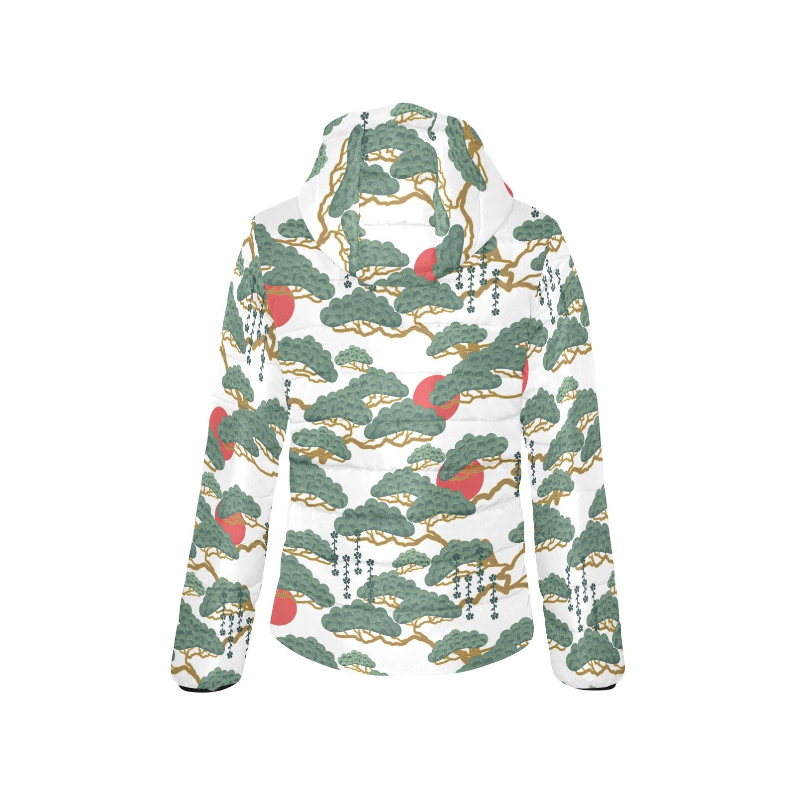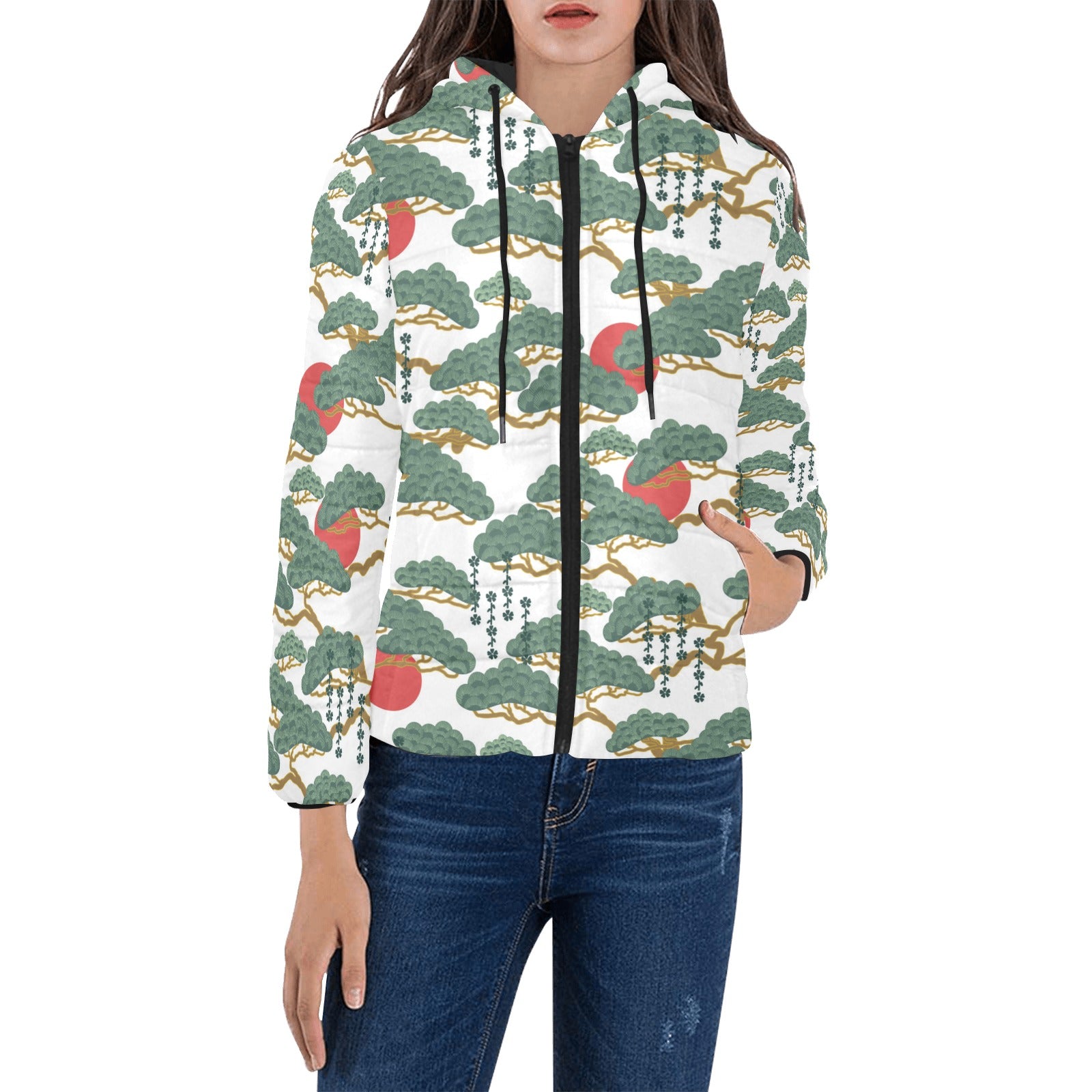 Bonsai red sun japanese pattern Women's Padded Hooded Jacket