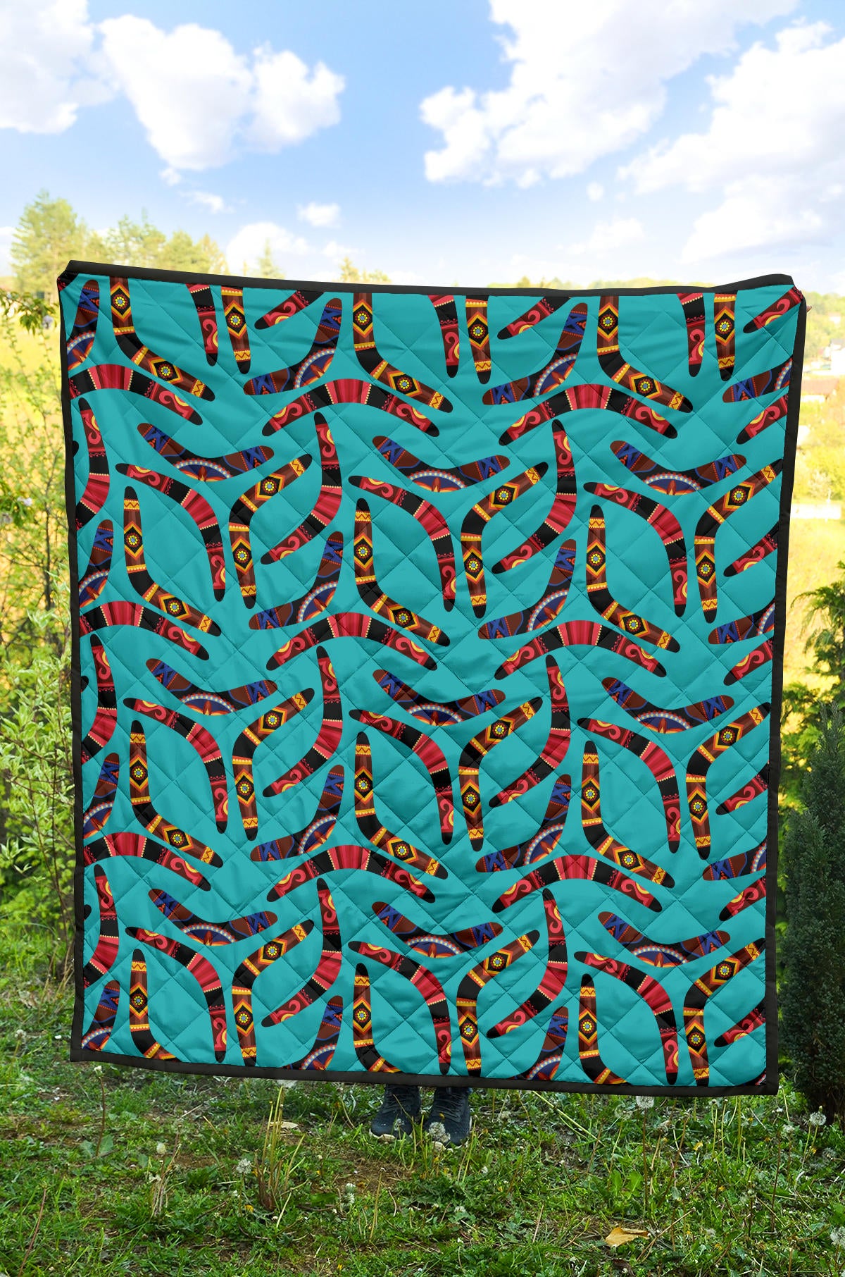 Boomerang Australian Aboriginal Ornament Blue Background Premium Quilt is a uniqued design and limited item. It made to order, hand printed, and sewn with love in our factory.