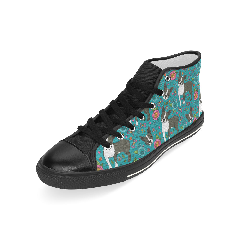Boston terrier beautiful flower pattern Men's High Top Canvas Shoes Black