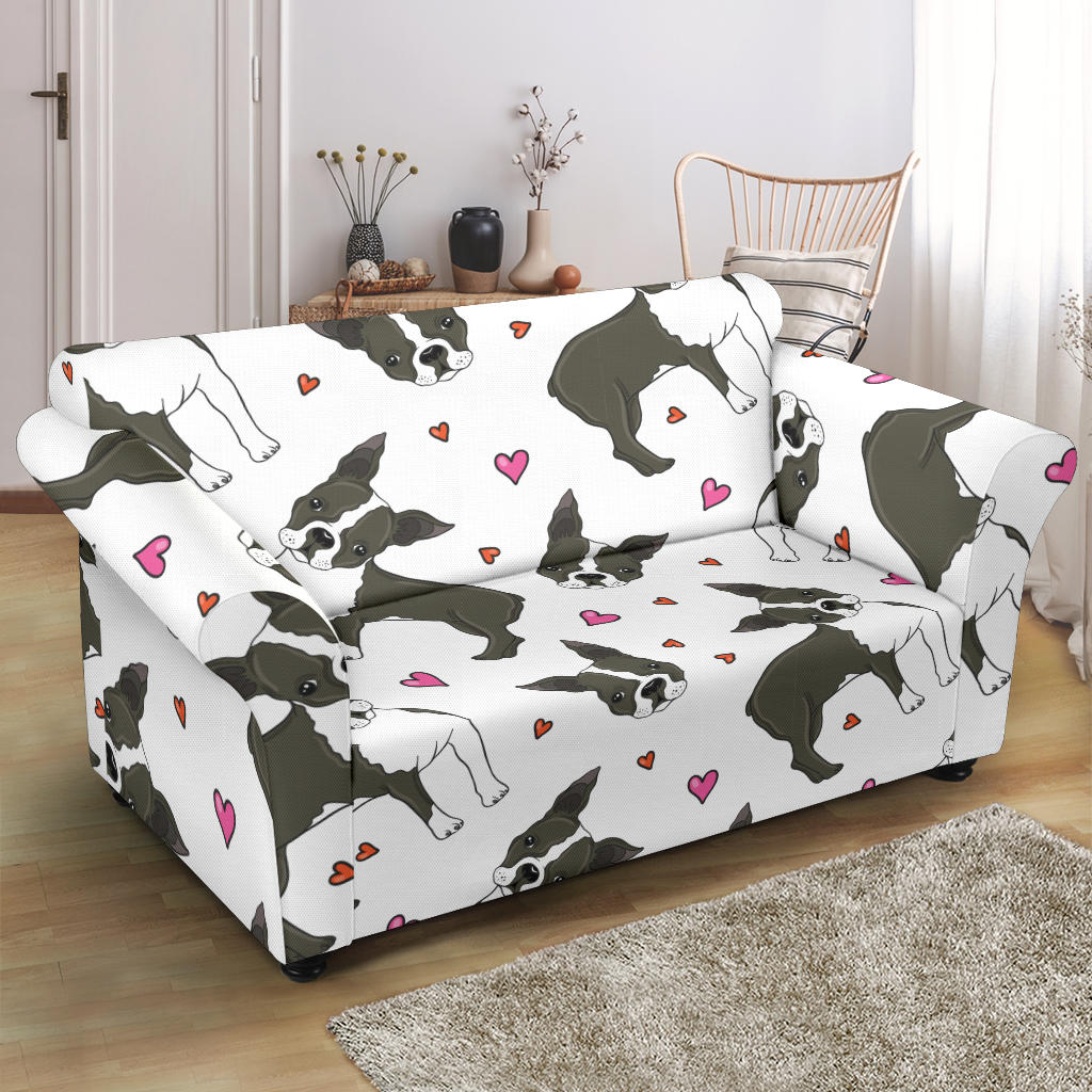 Boston Terrier Dog Hearts Vector Pattern Loveseat Couch Slipcover