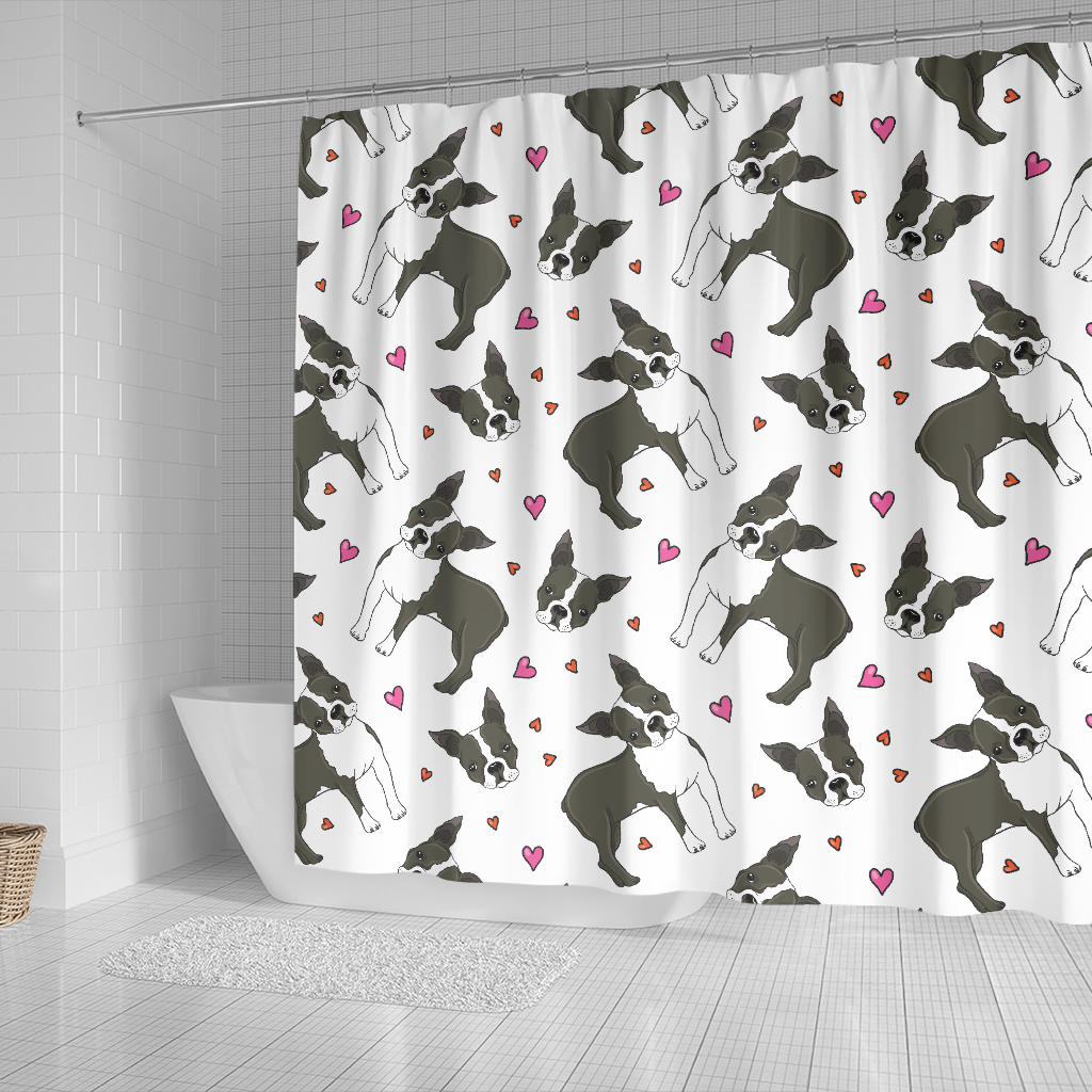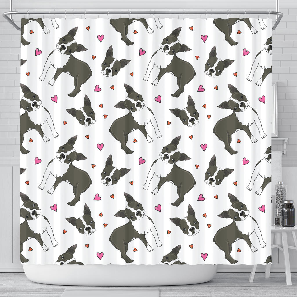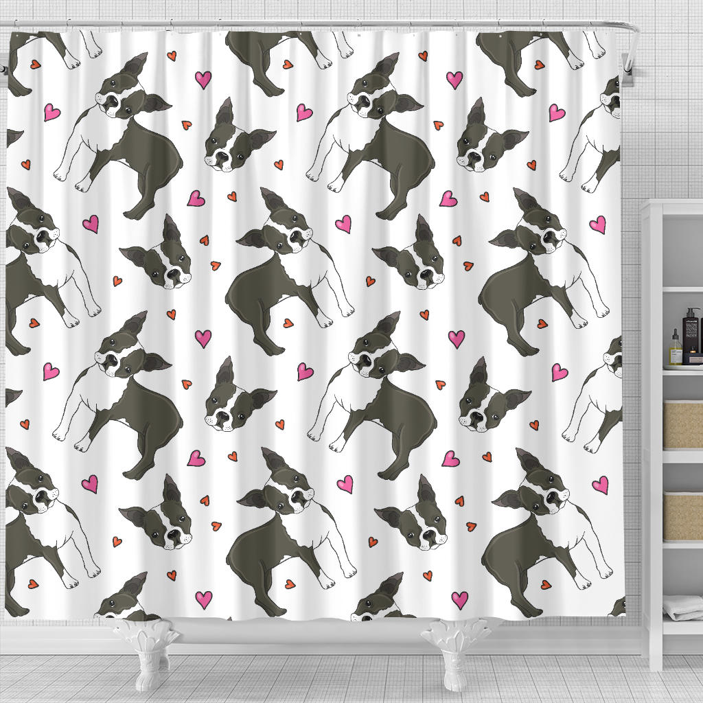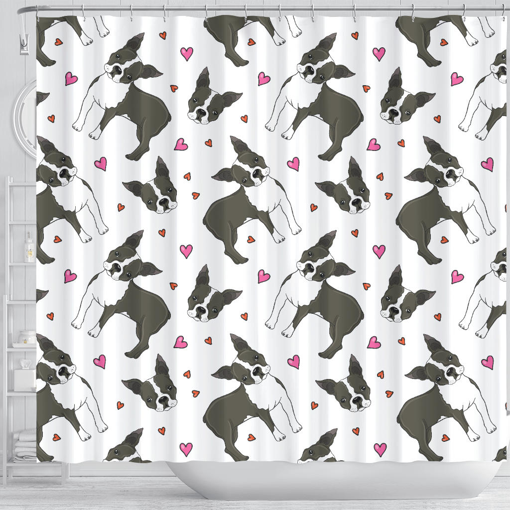 Boston Terrier Dog Hearts Vector Pattern Shower Curtain Fulfilled In US